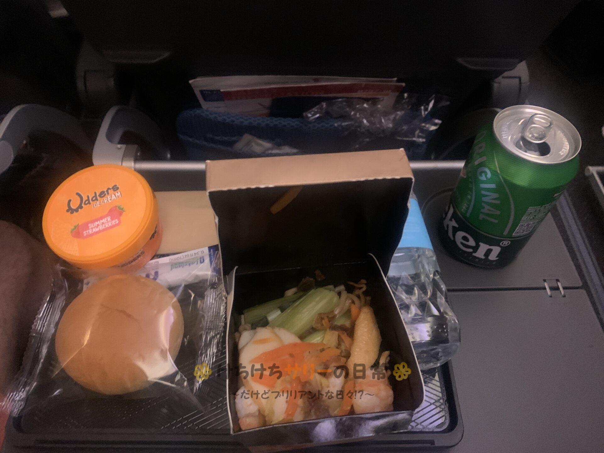 シンガポール航空はセントレアからバンコクまでの直行便がないので、まずは経由地のシンガポールに向かって出発🛫 出発がかなり遅延したみたいで、飛んですぐに出てきた機内食は完食したみたい😋 フルサービスキャリアの機内食は豪華で良いね✨