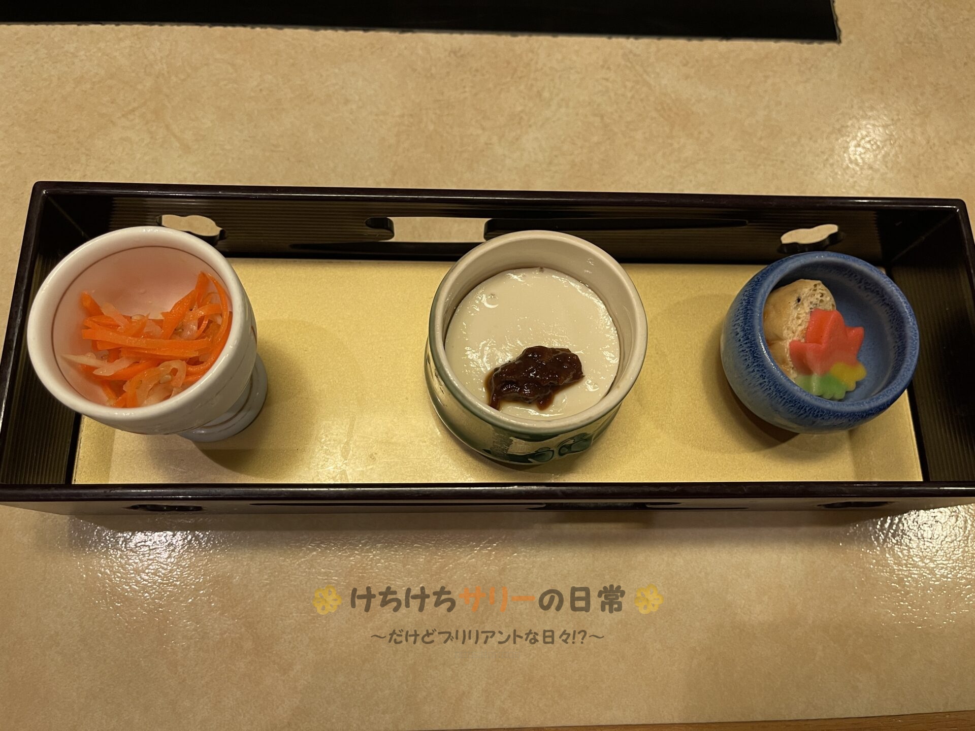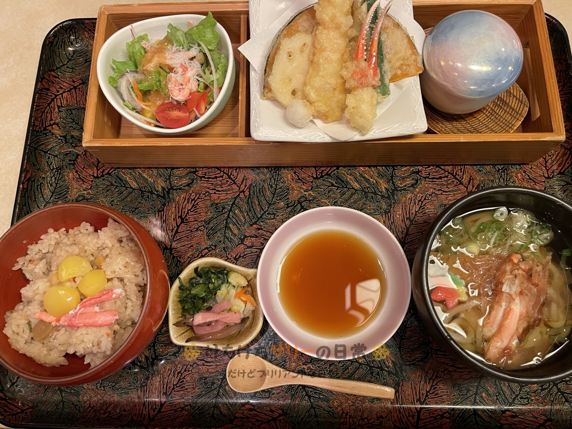 サリーパパ&サリーママ&親戚のおばさんは「秋の味覚膳:2,200円」を選んだ。カニの天ぷら&うどんにカニが入ってるしサラダにもカニがのっかってるけど、もっとカニを楽しみたかったみたいで、3人ともサリー達のコースにすれば良かったと言ってたよ😁