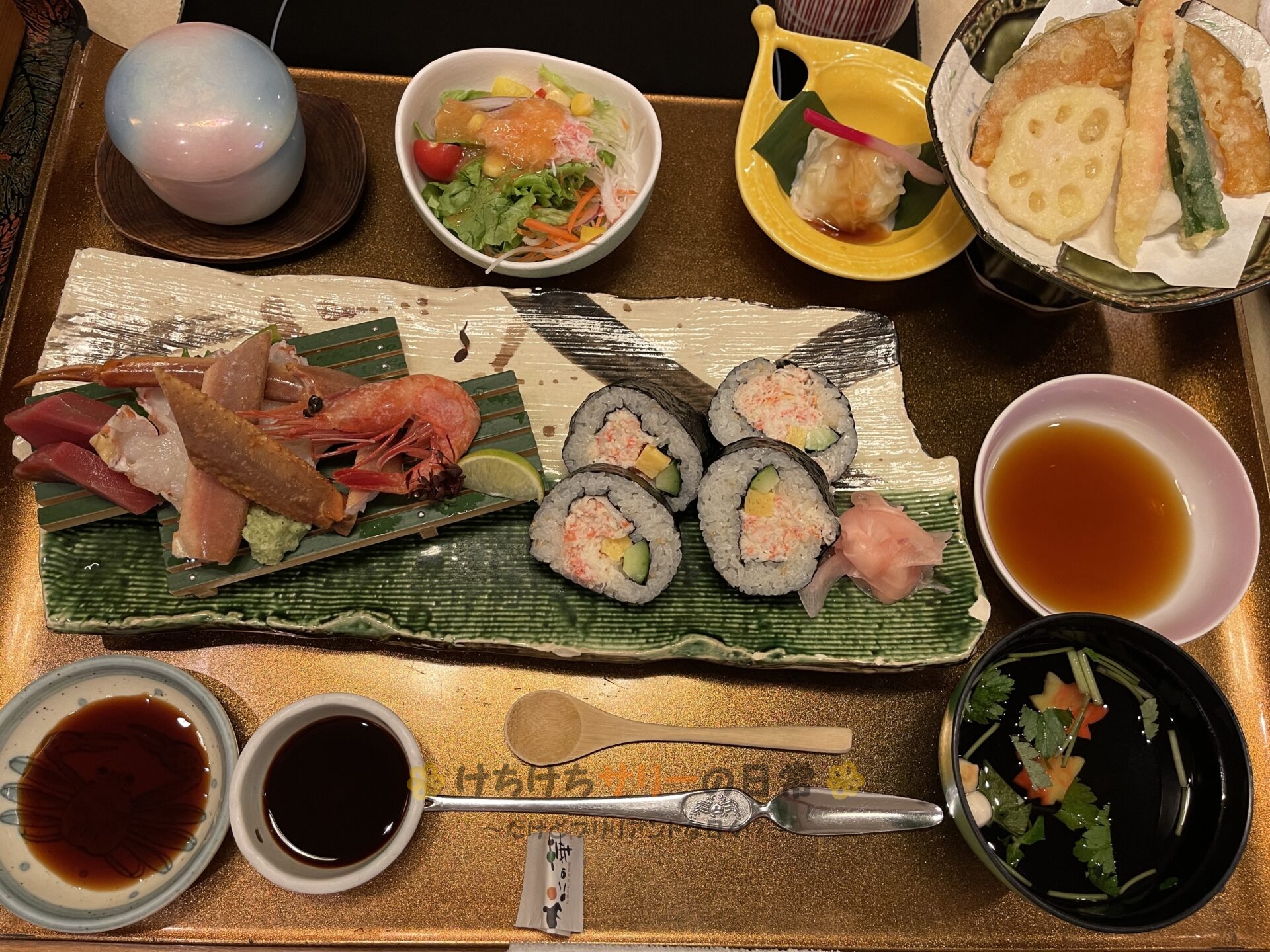 サリーと相方は「かに太巻きランチ:2,420円」にしたよ🦀 太巻きだけじゃなくて、カニのお刺身や天ぷらまであってカニを思う存分堪能できたよ✨