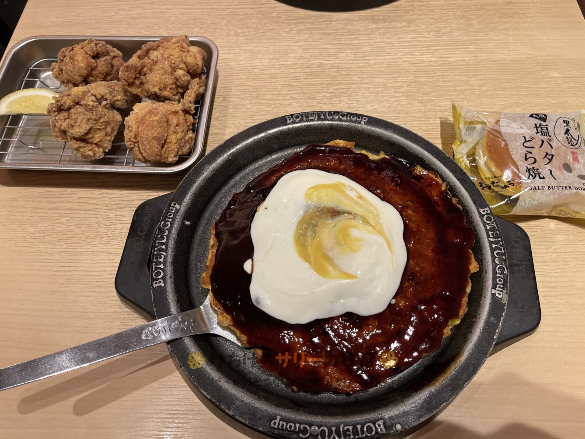 モダン焼きにから揚げ、塩バターどら焼きを食べる。