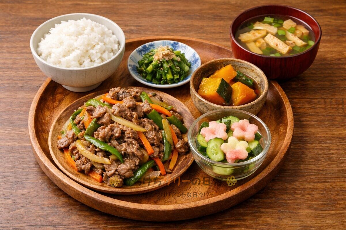 この日の夕ご飯はネギと油揚げの味噌汁、菜の花のおひたし、かぼちゃの煮物、きゅうりと麩の酢の物、牛肉野菜炒め。