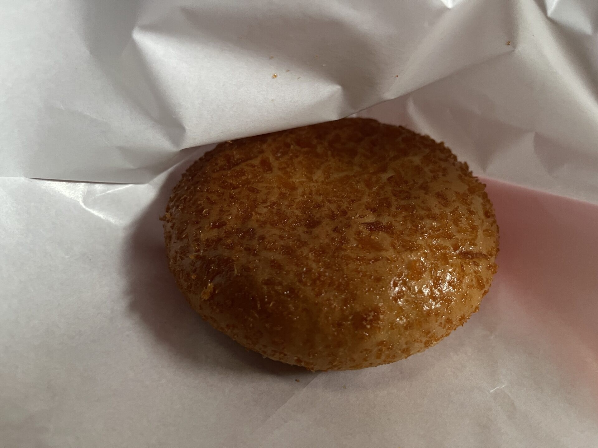 朝ご飯に買ったのは「お店で揚げたカレーパン:160円」。 お店に入ったらちょうど揚げたてのカレーパンを店員さんがケースに入れているところだったから、それにつられて買ったよ👍