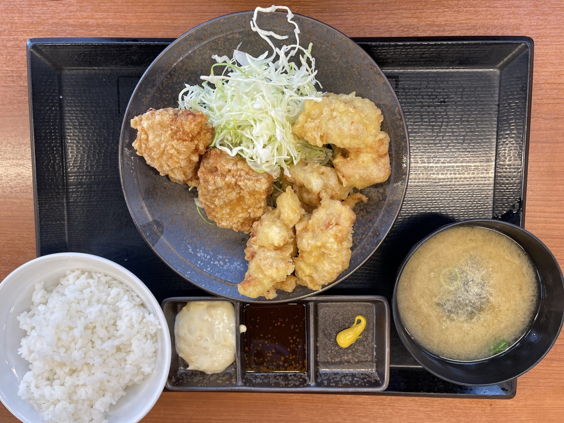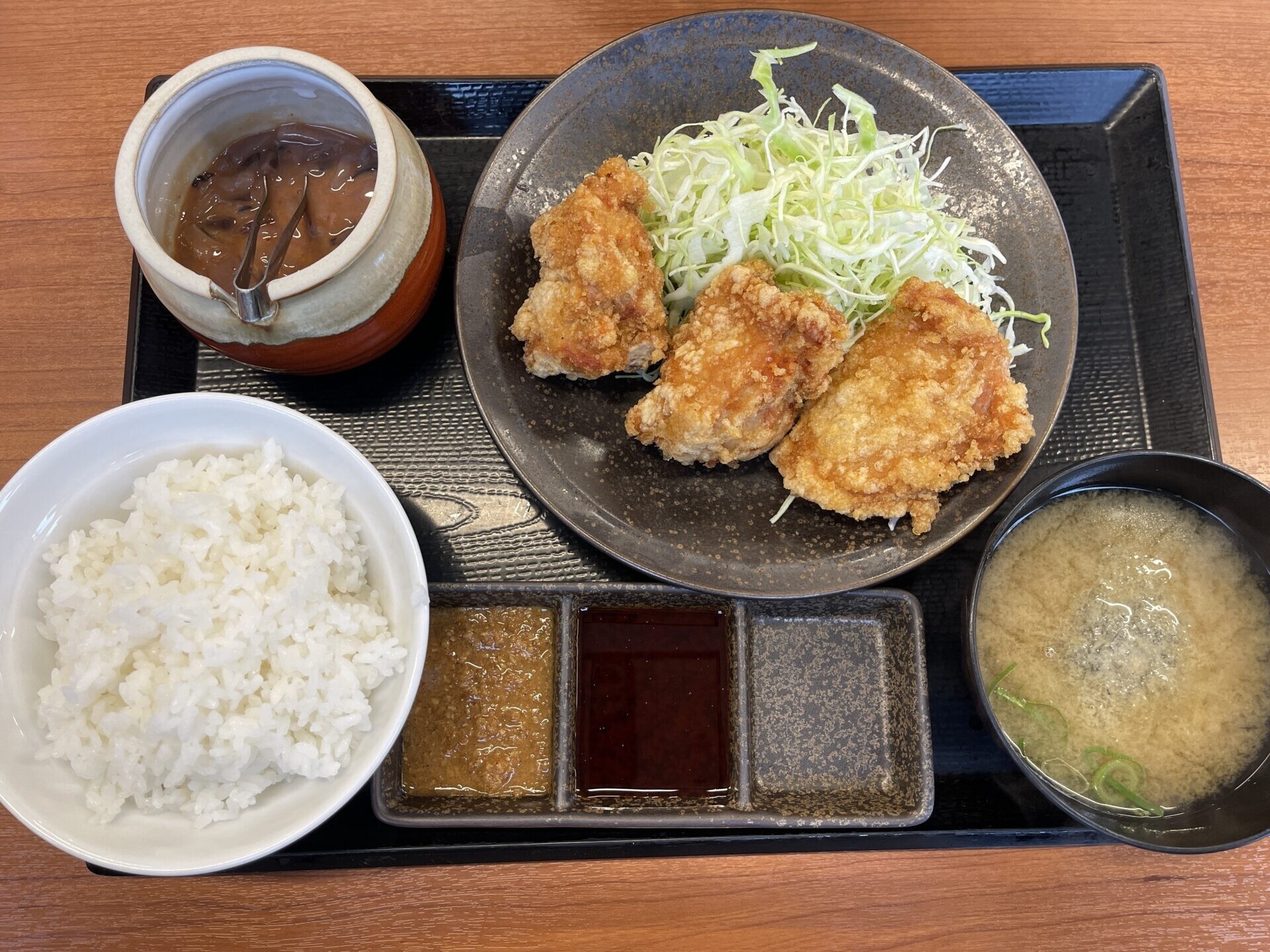 サリーが注文したのは「からやま定食(3個):715円」。 から揚げは1個ずつが大きいから3個で十分!! しかも"イカの塩辛(から揚げの左側に移っている壺)"が食べ放題だからご飯が進む😁