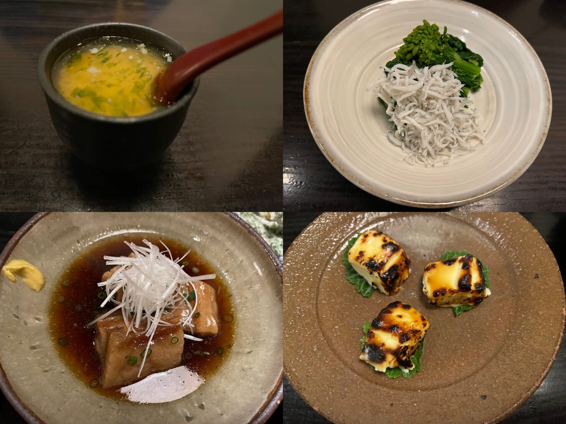 左上から時計回りに「お通しの豆腐餡かけ」、「菜の花のおひたしとじゃこ:638円」、「クリームチーズの西京焼き:715円」、「豚の角煮:858円」。