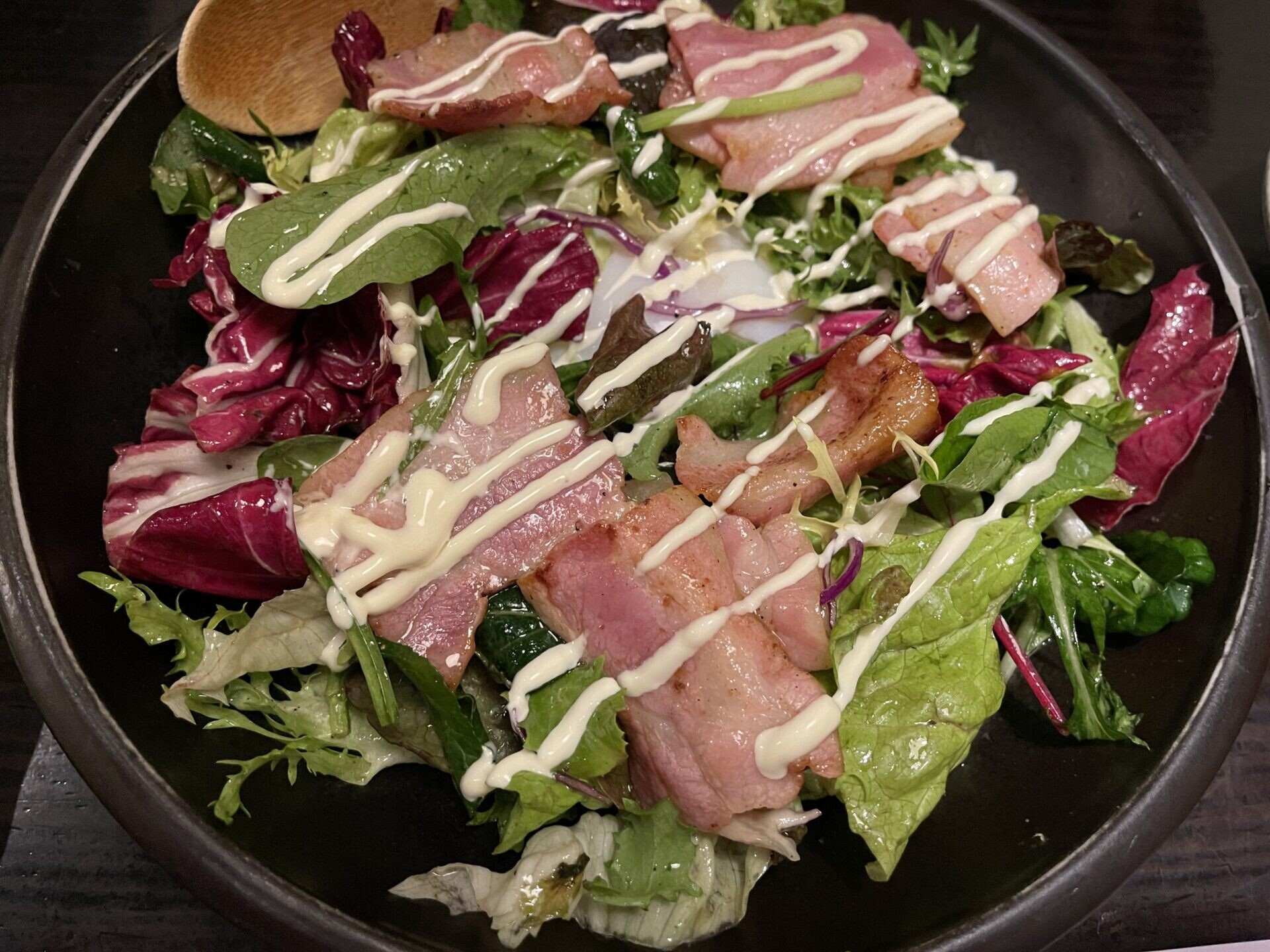 「法蓮草とマッシュポテトとベーコンのサラダ:913円」。 サラダの下に隠れてたマッシュポテトが美味しかった❤