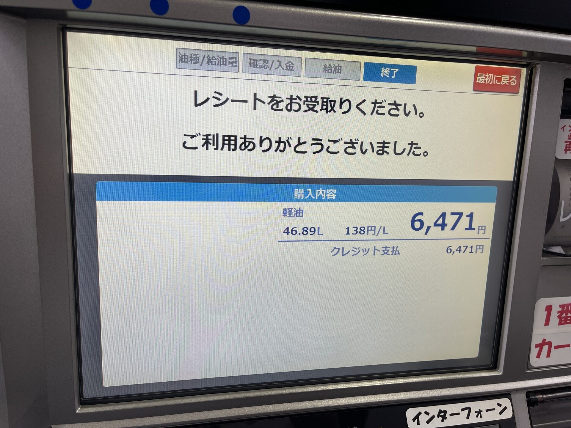 1リットル138円で46.89リットル入ったので6,471円だった。