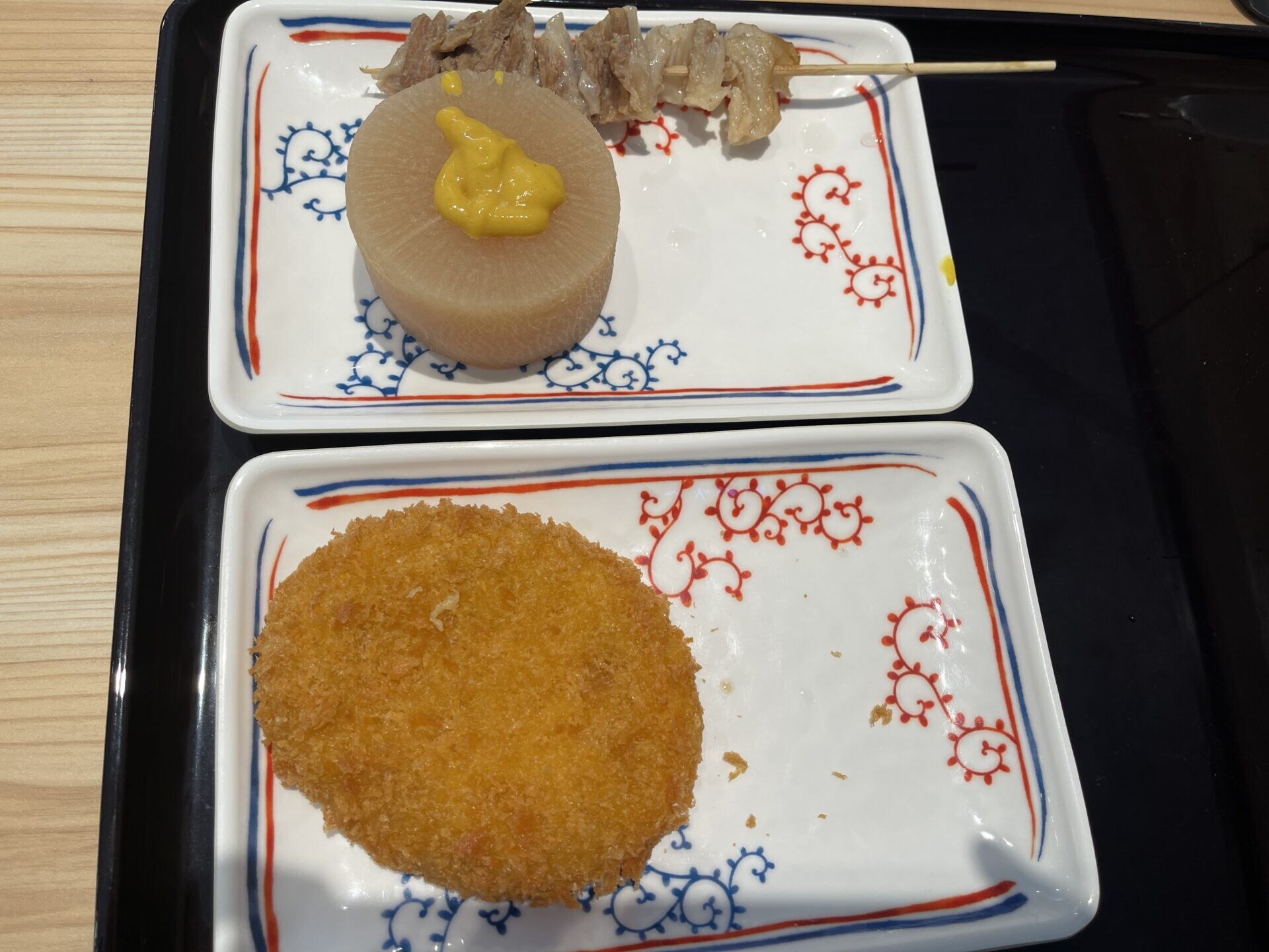 付け合わせに「牛すじ:160円、大根:120円、北海道男爵のコロッケ:160円」も注文。