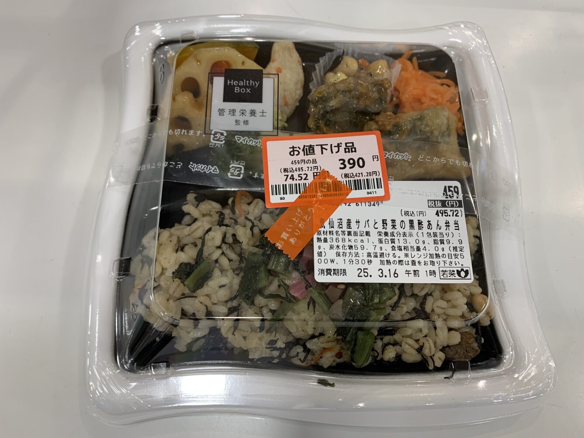 健康そうでお得な夜ご飯もゲットできたみたいで、この日の夜ご飯は「気仙沼産サバと野菜の黒酢あん弁当:定価496円のところ15%OFFで421円」。