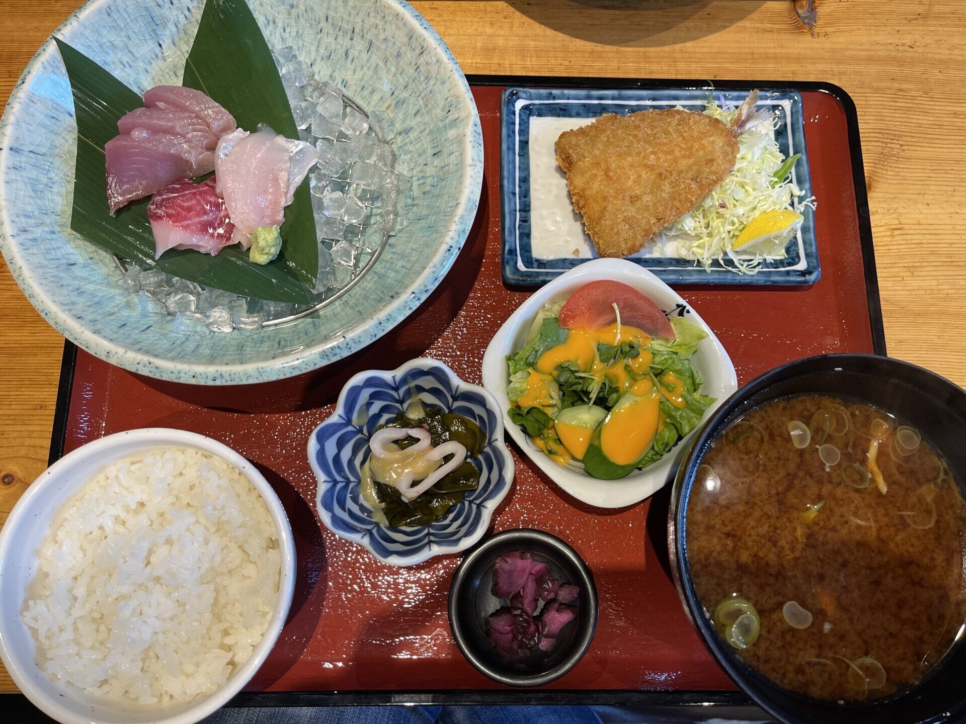 3種類のお刺身(キメジマグロ、カガミダイ、ボラ)にアジフライも付いてとってもお得🉐 そしてお味噌汁が特大の赤だしってのが名古屋人には幸せなんだよね😊