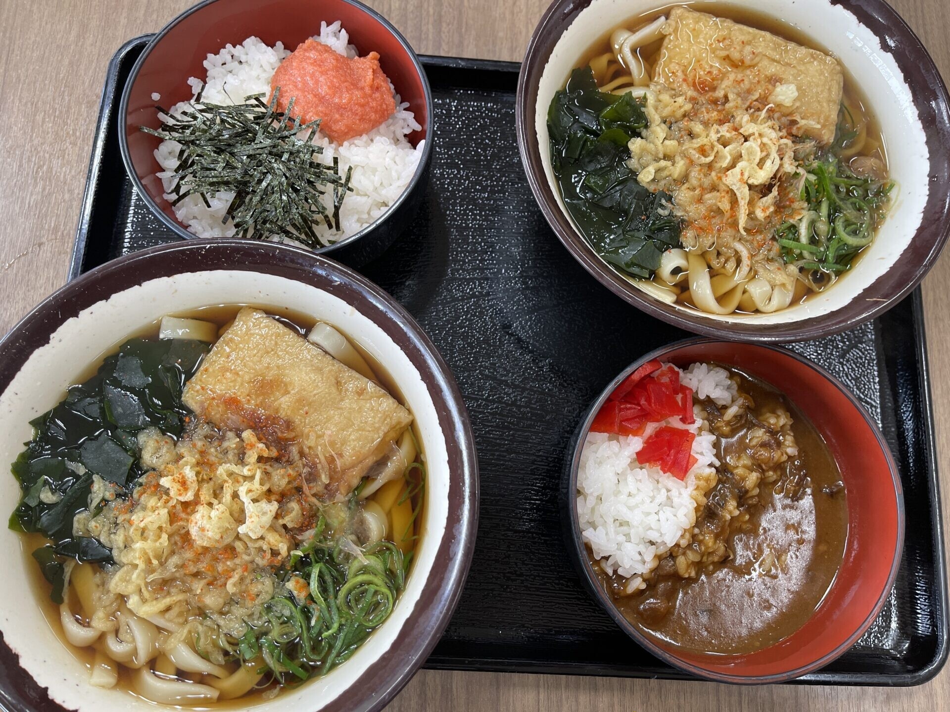 サリーは写真下側の「きしめん:340円+ミニカレー丼:240円」、相方は写真上側の「きしめん:340円+明太ご飯:240円」にしたよ😉