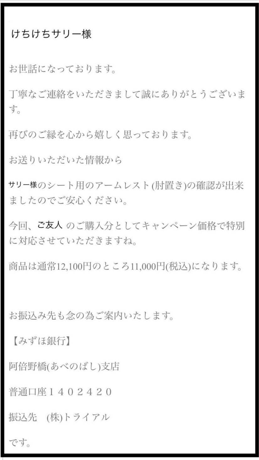 更にサリー達と同じく運転席と助手席のシートをサリー達が買ったのと同じ会社で購入する事に決めたと教えてくれたので、図々しくもシートを買う時に一緒に助手席のアームレストも購入して欲しいとお願いした。そしたら色々と値段交渉までしてくれて、本来であればシートを購入しないとキャンペーン価格にしてもらえないんだけど、そのご夫婦に紹介したお礼にとキャンペーン価格でアームレストを購入させて貰える事になったよ✌
