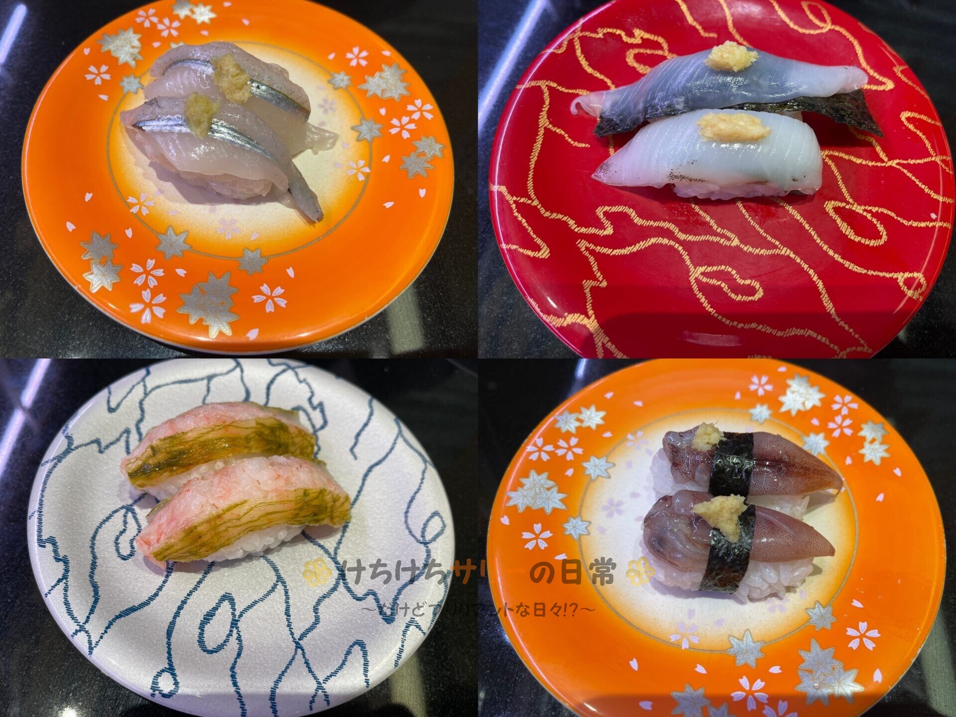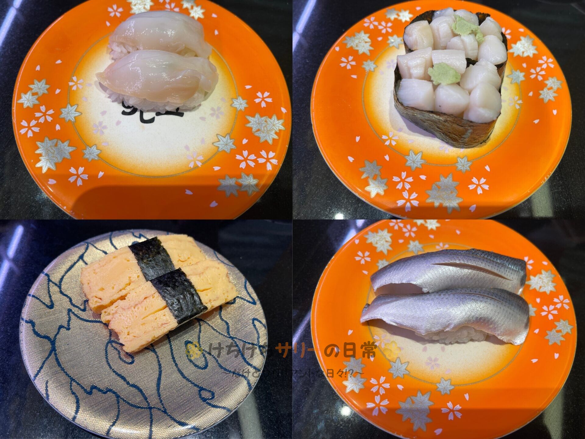 左上から時計回りに「つぶ貝:330円」、「小柱軍艦:220円」、「こはだ:275円」、「玉子:110円」。
