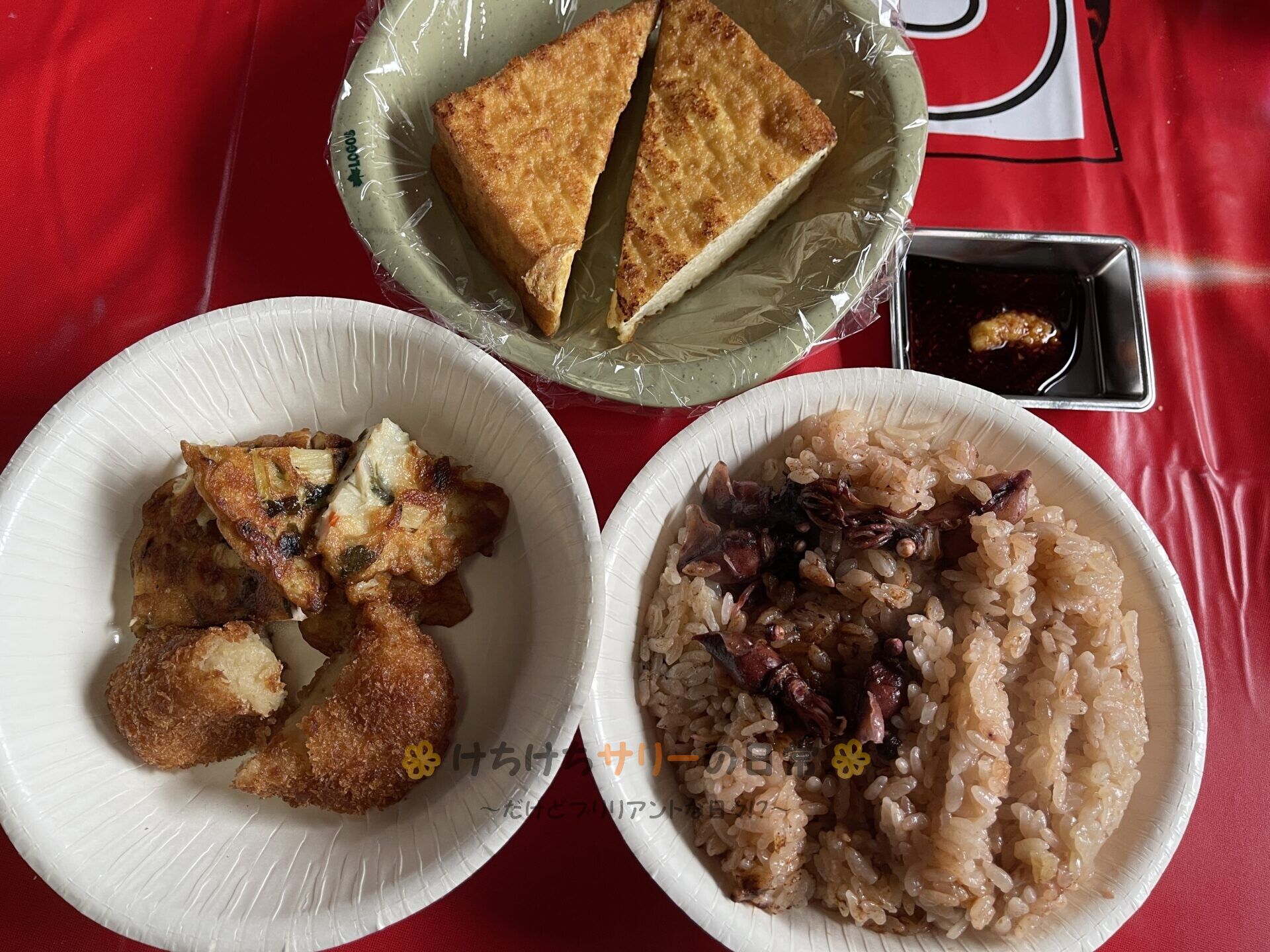 この日のお昼ご飯はまあちゃんからいただいた「ホタルイカご飯」、「コロッケ&チヂミ」、そしてサリー達が焼いた「厚揚げ」だよ。