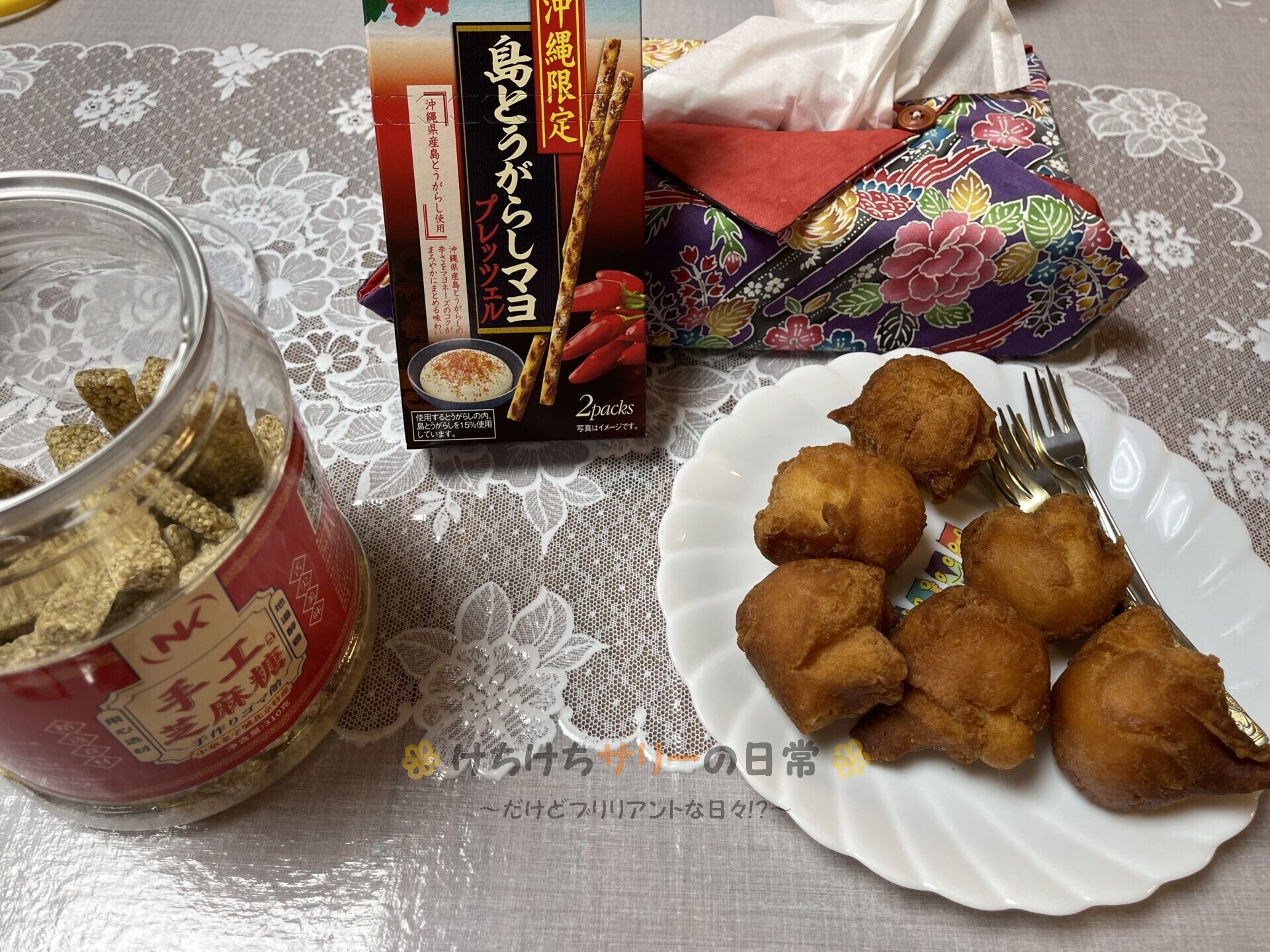 奥様が沖縄出身で最近沖縄に遊びに行っていたとの事で、沖縄限定の島とうがらしマヨプリッツやサーターアンダギーまでいただいちゃった🍩