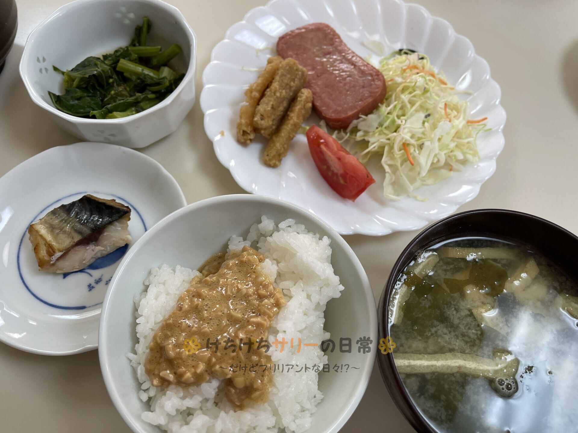 サリー達なら納豆ご飯だけなのに、焼き魚にスパム、お味噌汁まで作ってくれてありがたいやら、申し訳ないやらの気持ちでいっぱいだよ😭