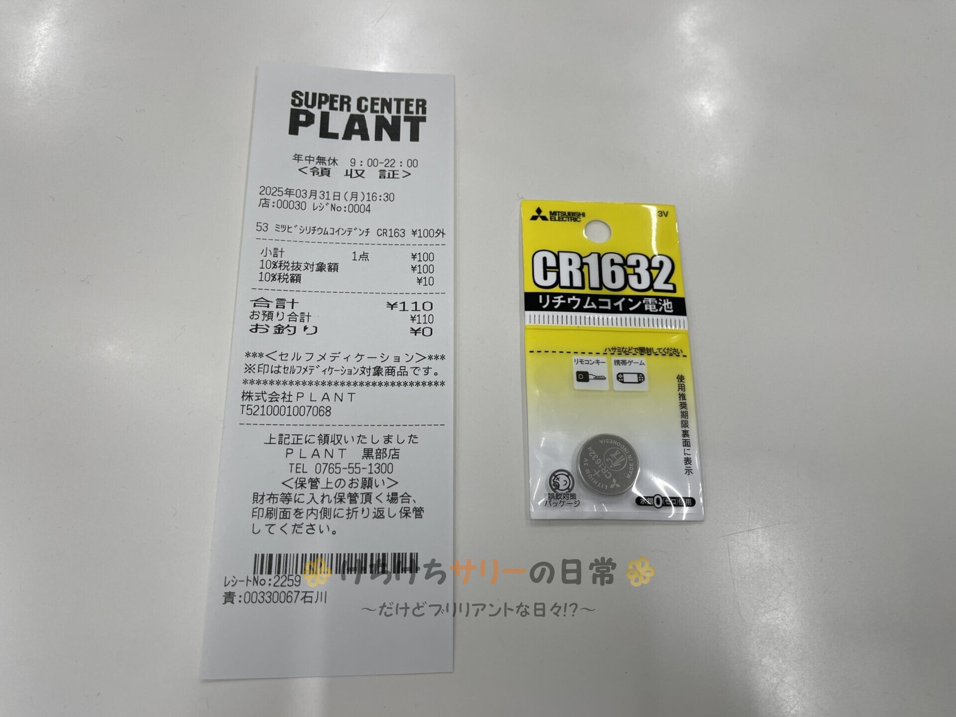 この前、タイヤ空気圧モニターの電池を相方が1個変えてくれたんだけど、他のタイヤの電池が切れてしまったので100円ショップでリチウムボタン電池を購入(マイペンライ号にはタイヤが6個ついている)。