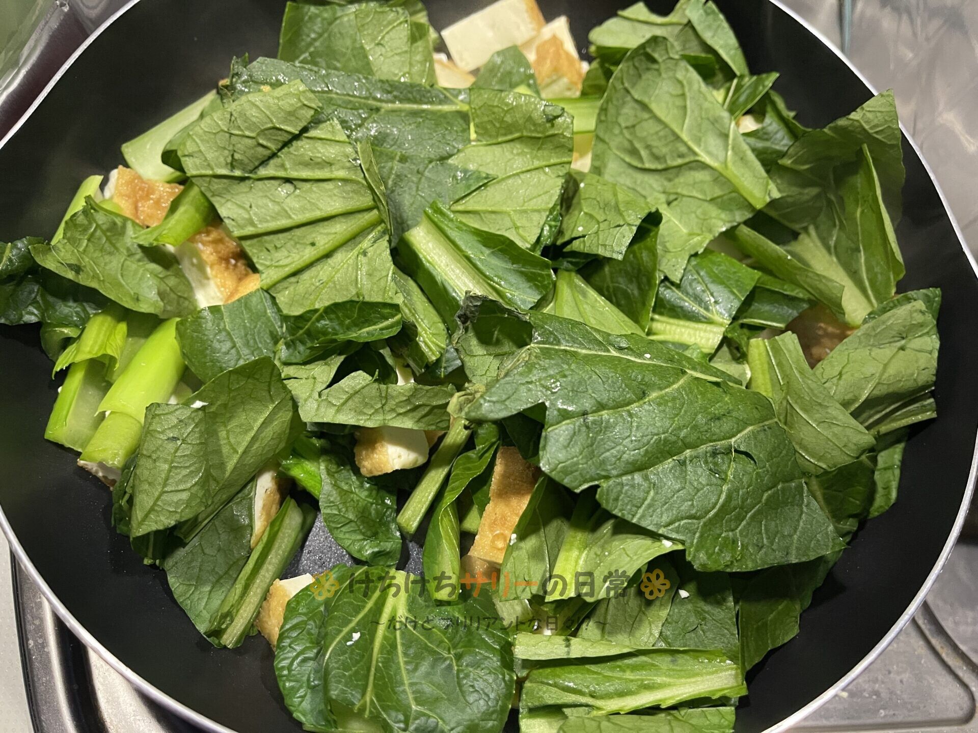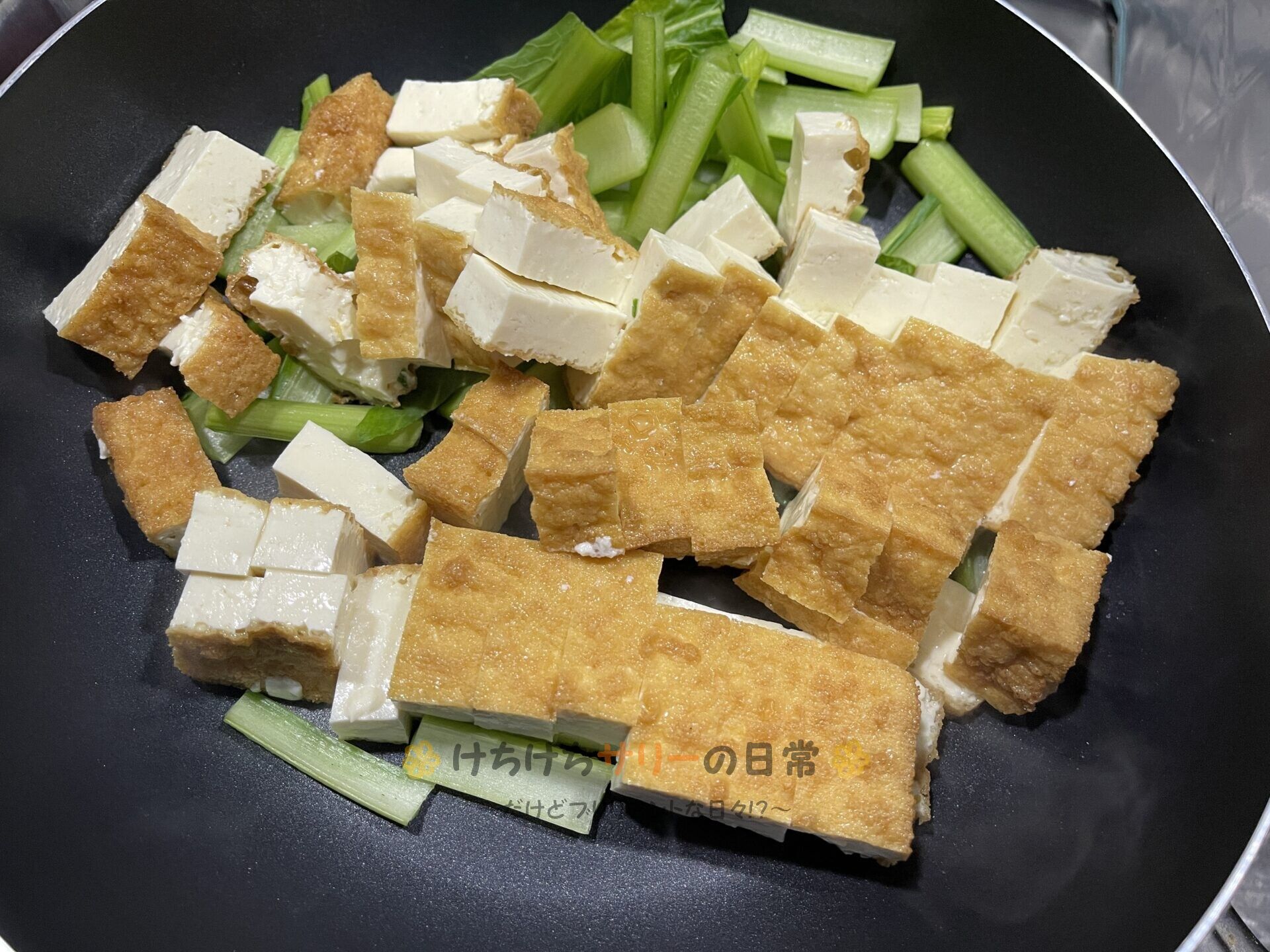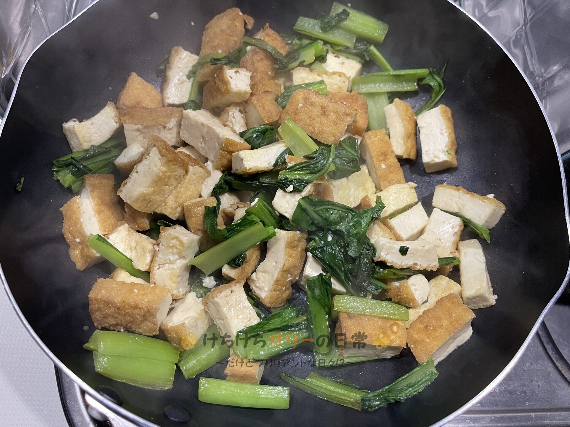 仕事後は夕ご飯にサッと調理に取り掛かる。残っていた厚揚げと小松菜の茎を炒めて…
