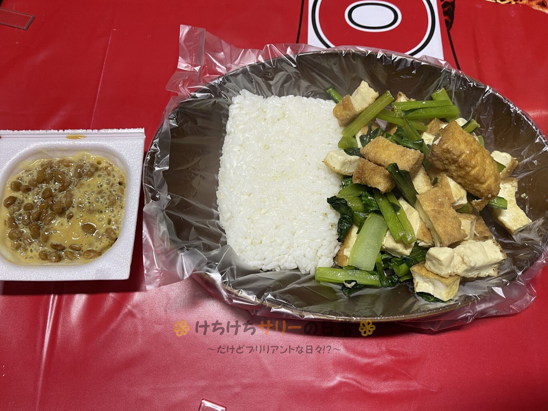 この日の夕ご飯は「ご飯」、「納豆」、「小松菜と厚揚げの炒め物」だよ。