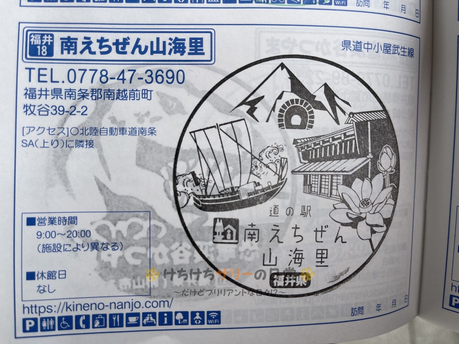スタンプをゲット! 道の駅の名前の通り、スタンプは山と海と里を連想させるデザインだよ⛰