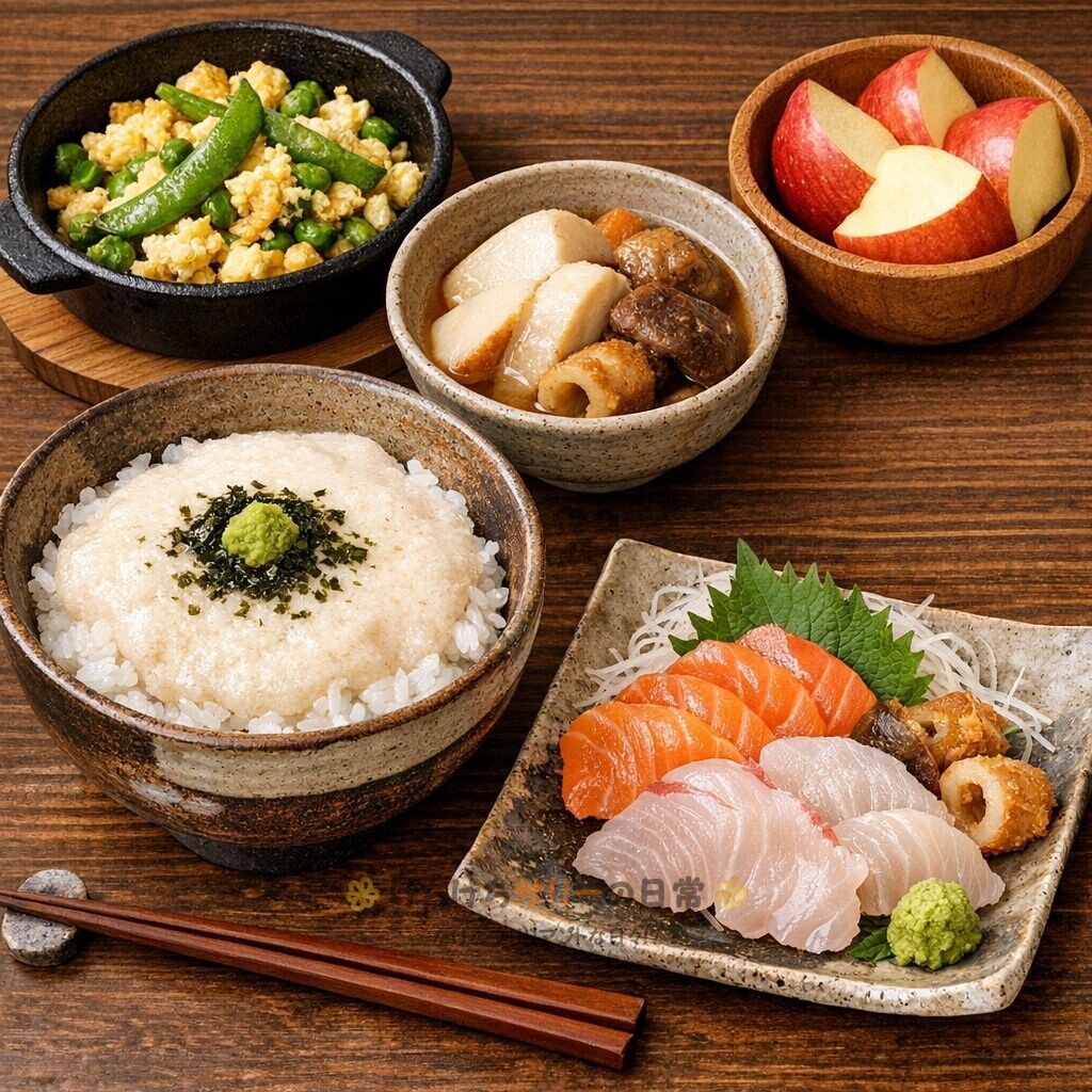 サリーママが「エンドウの玉子炒め」、「はんぺいとちくわの煮物」、「サーモンと鯛の刺身」、「りんご」も準備してくれたよ。 ※画像はいつものようにチャッピー作成