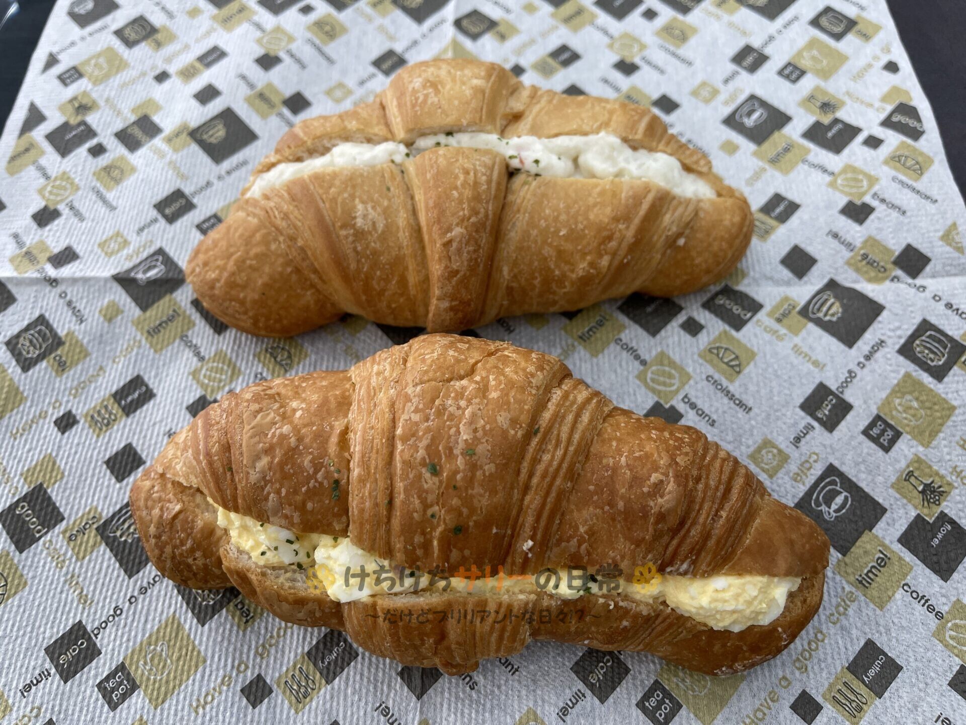 写真上が「ポテトサラダクロワッサンサンド:108円」、写真下は「玉子サラダクロワッサンサンド:108円」。