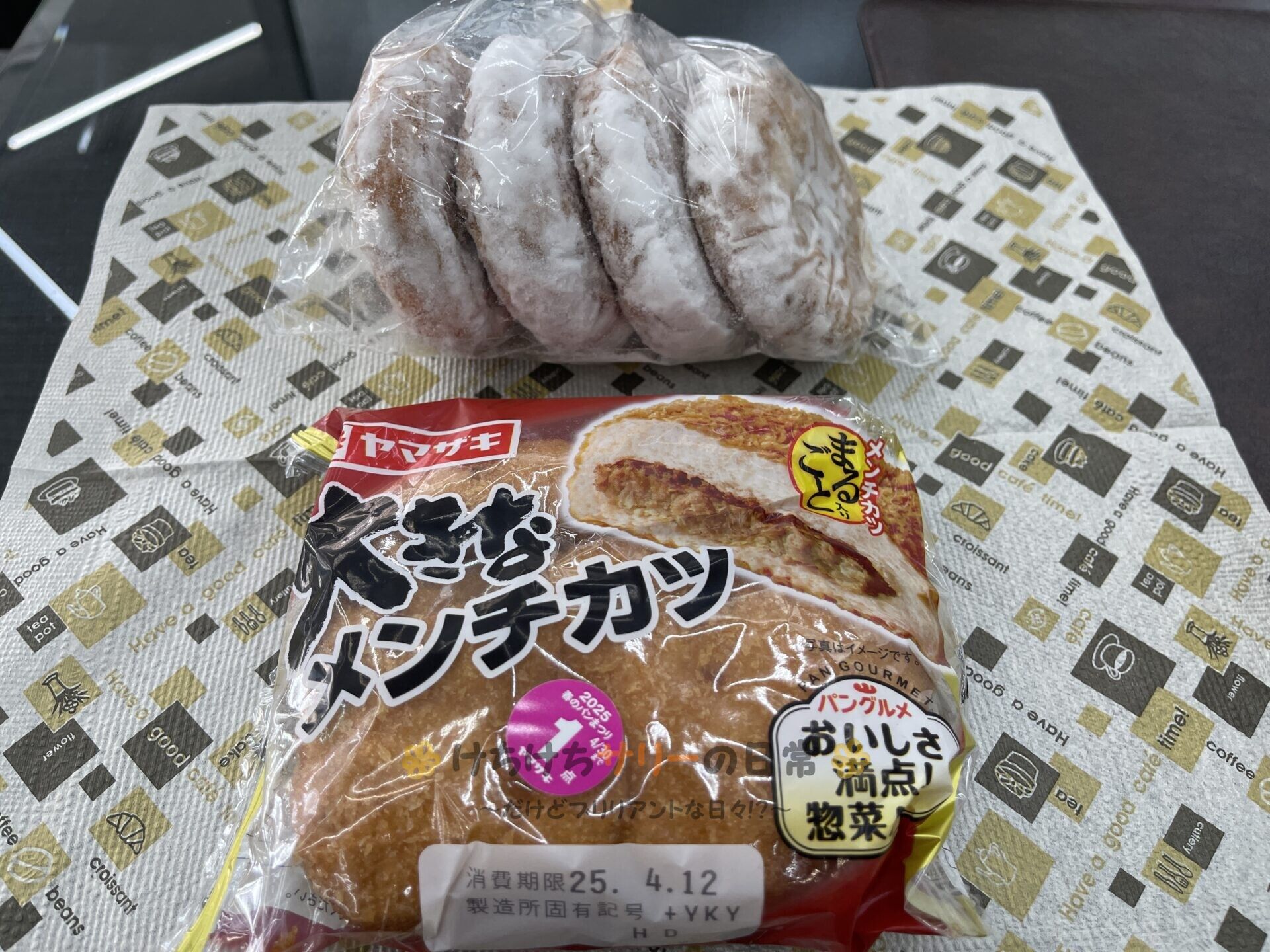 相方はこれだけでは足らなかったみたいで、写真上の「あんドーナツ:4個で214円」を1個と「大きなメンチカツ:138円」も追加で食べてた😁