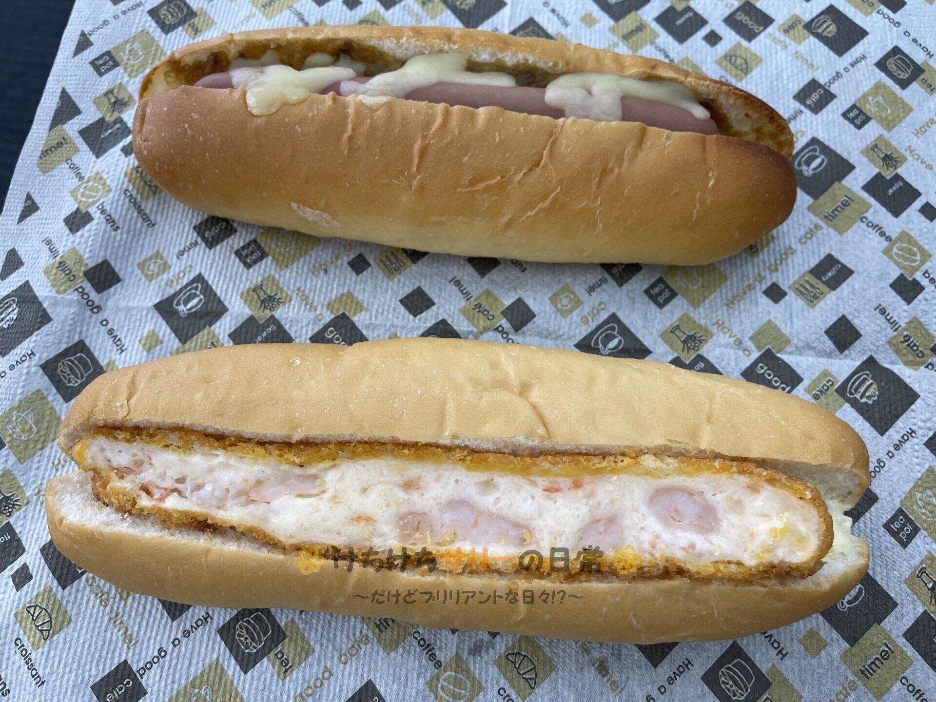 写真上が「チーズカレードッグ:138円」、写真下が「海老カツドッグ:199円」。