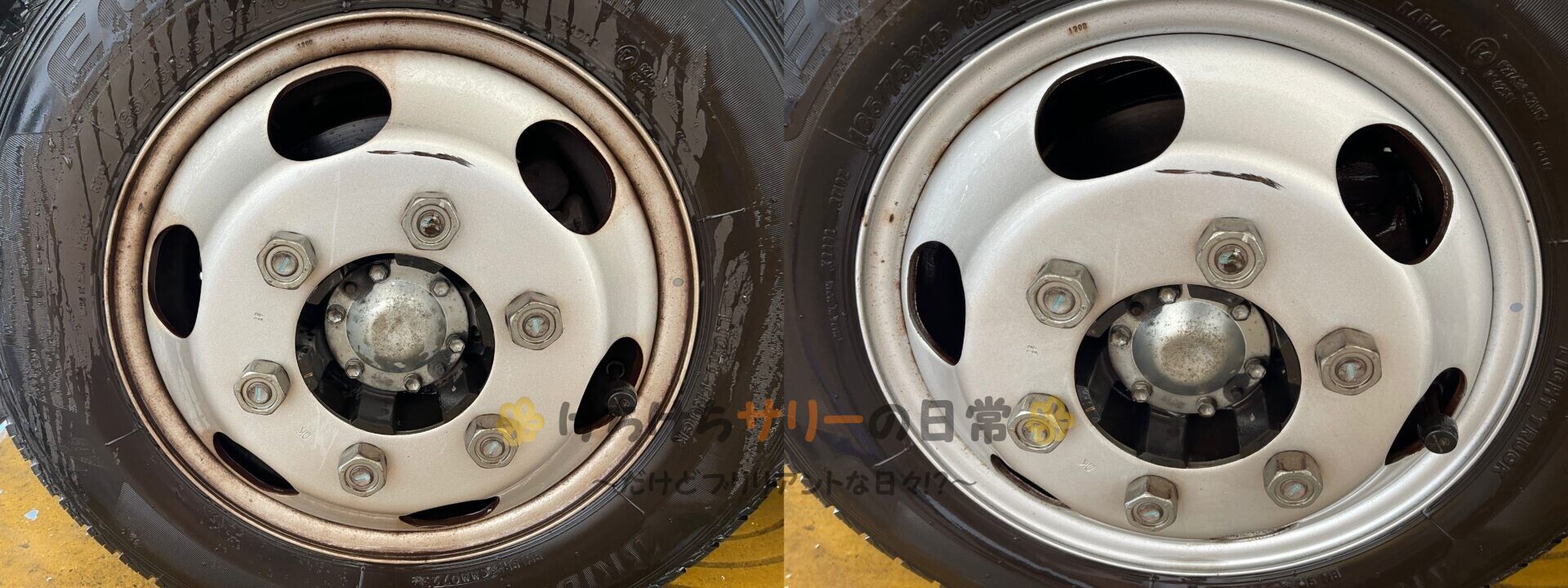 写真左が洗車前、写真右が洗車後だよ✨ アラッ、ホイールに傷がついてるね😮