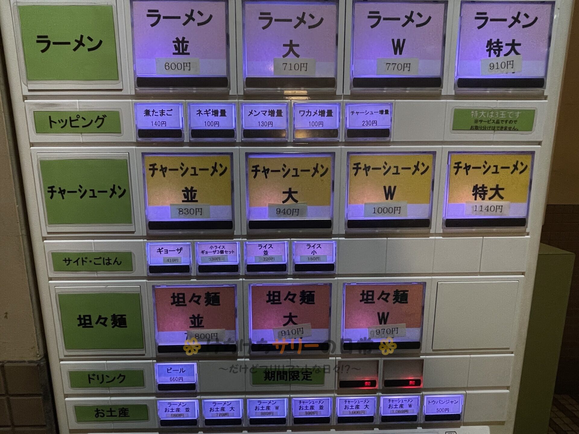 まずは食券を買う。 ちなみにラーメン特大は安いけど3玉分あるから、よほど自身がある人じゃないと頼んじゃダメだよ🙅♀️
