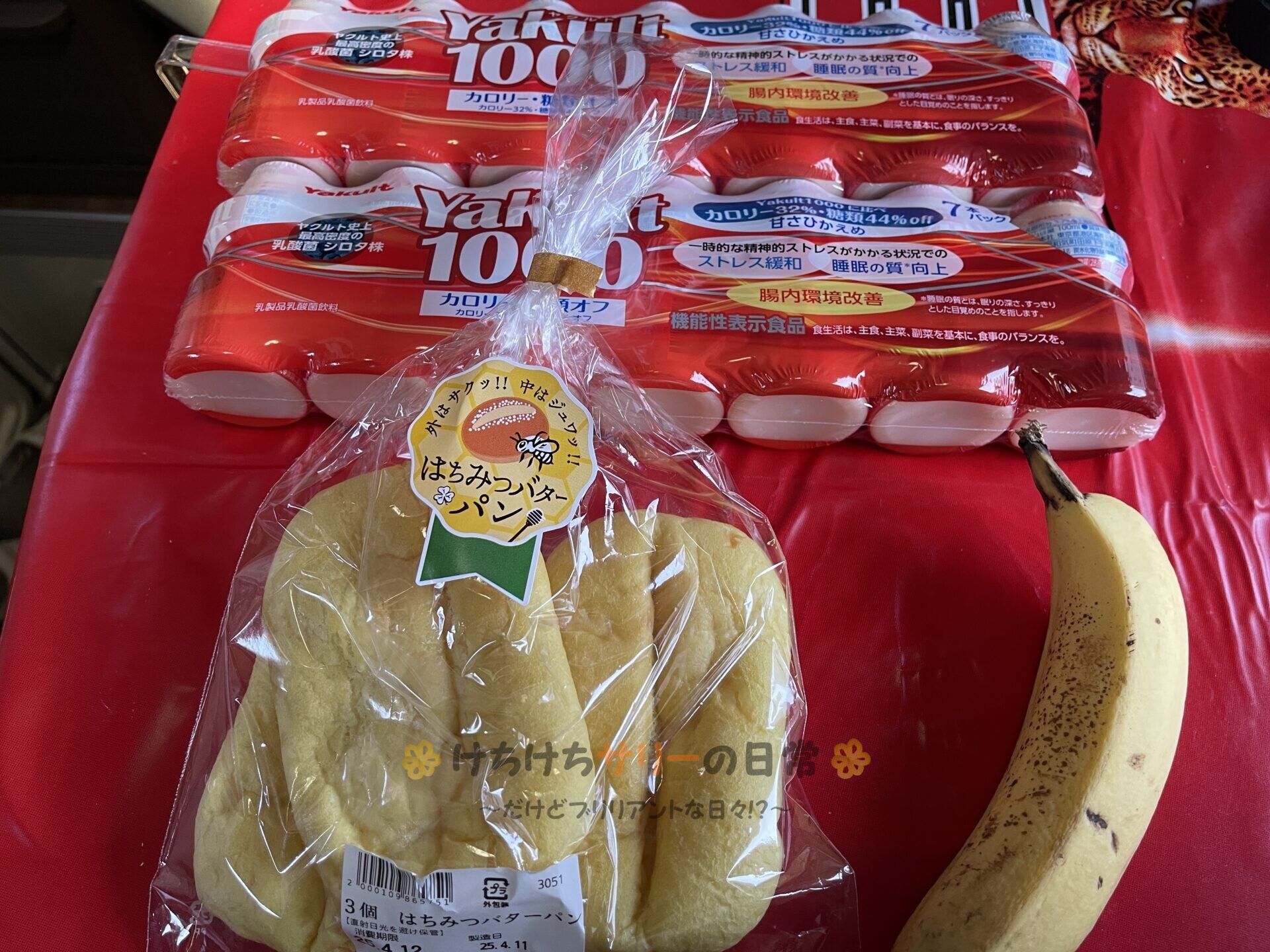 起きたら、サリーママが「はちみつバターパン」と「バナナ」をくれたので朝食に食べたよ。更にヤクルト1000を14本もくれた😍