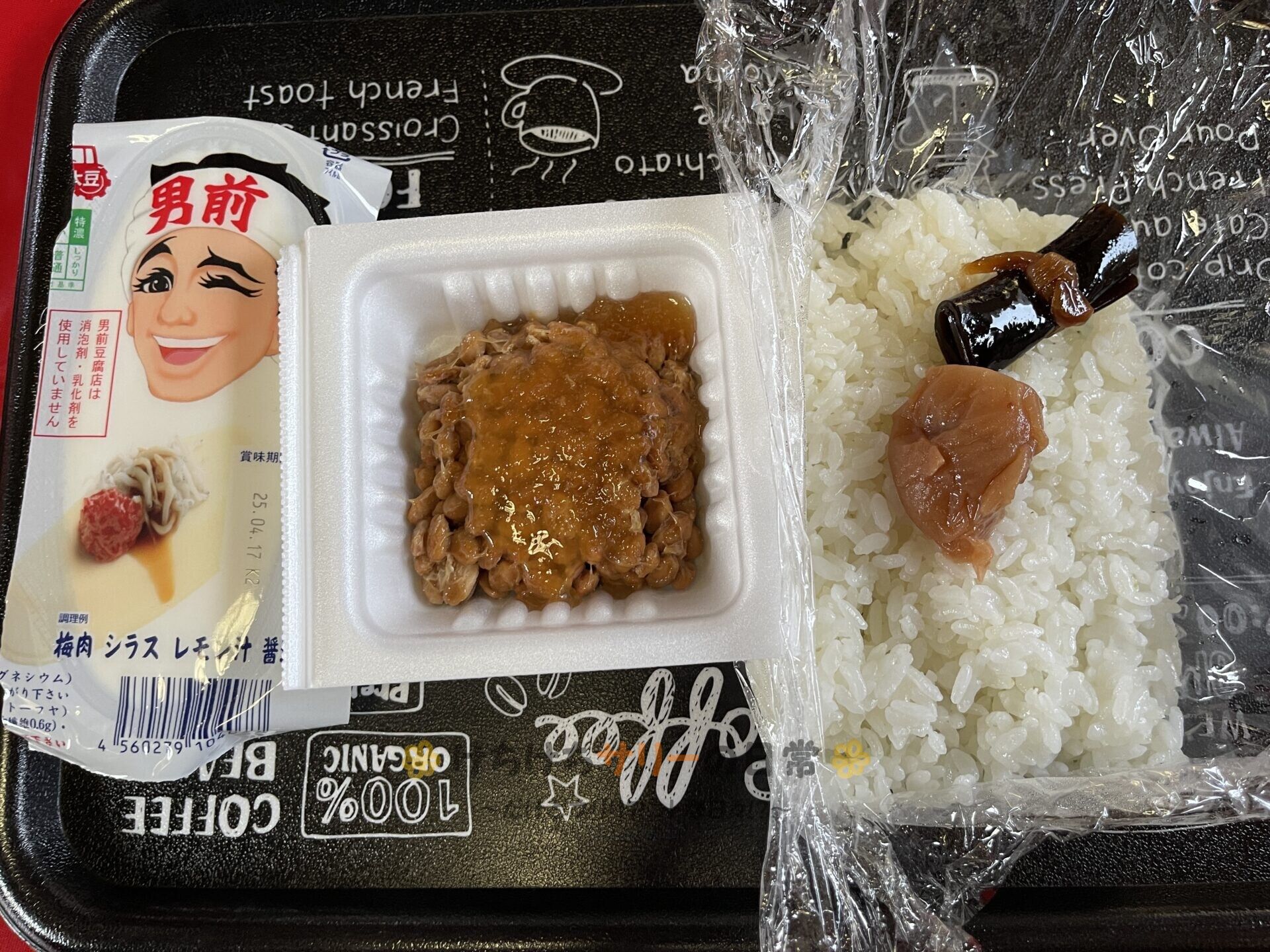 この日のお昼ご飯は「サリーママからもらったご飯with梅干し&昆布巻き」、「納豆」、「冷奴」だよ。