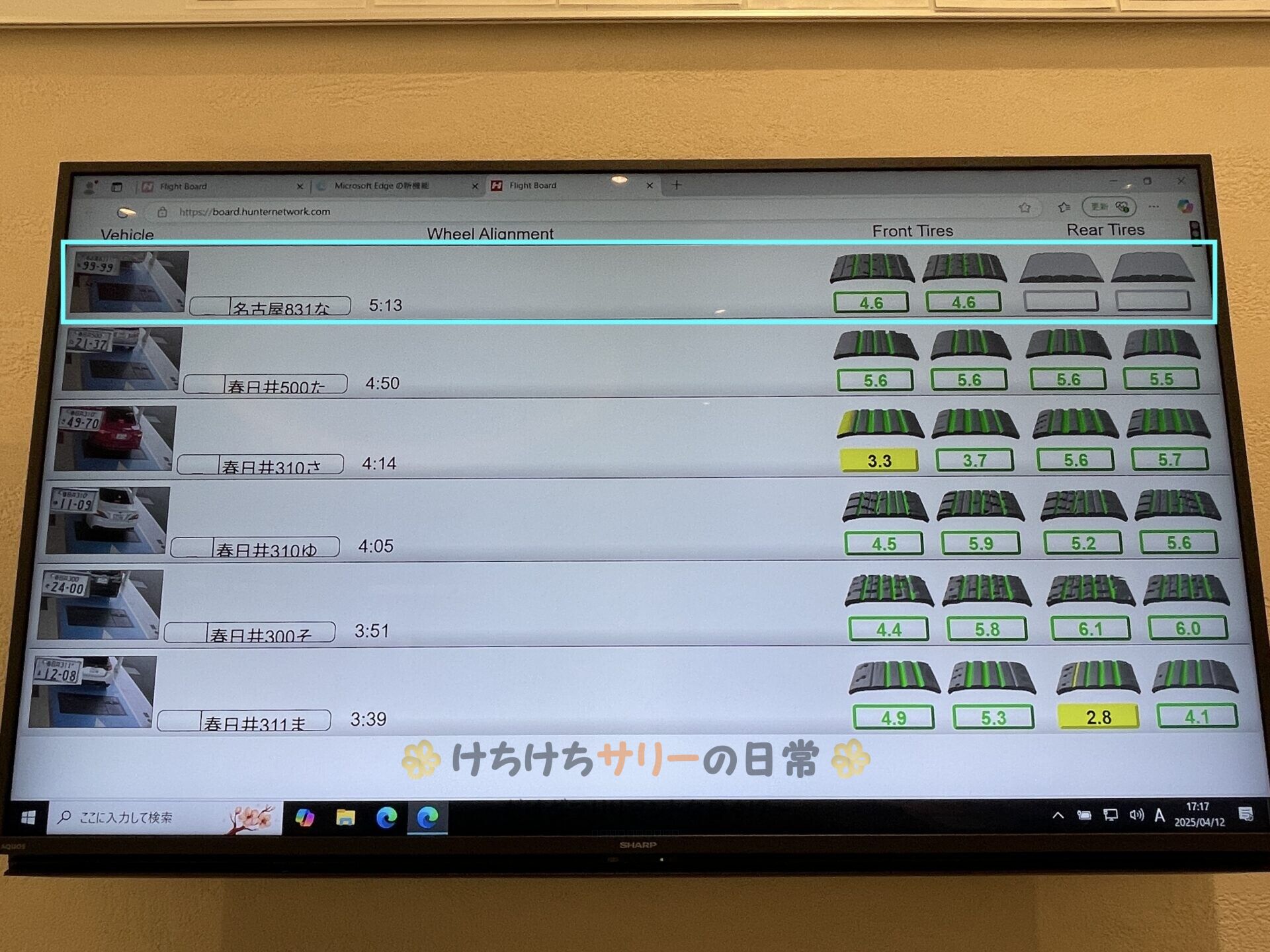 マイペンライ号のタイヤ残量は前のタイヤが4.6で、後ろのタイヤは計測できなかったみたい😅 マイペンライ号は後ろにタイヤが4個ある特殊な形状だから対応してないんだと思う。