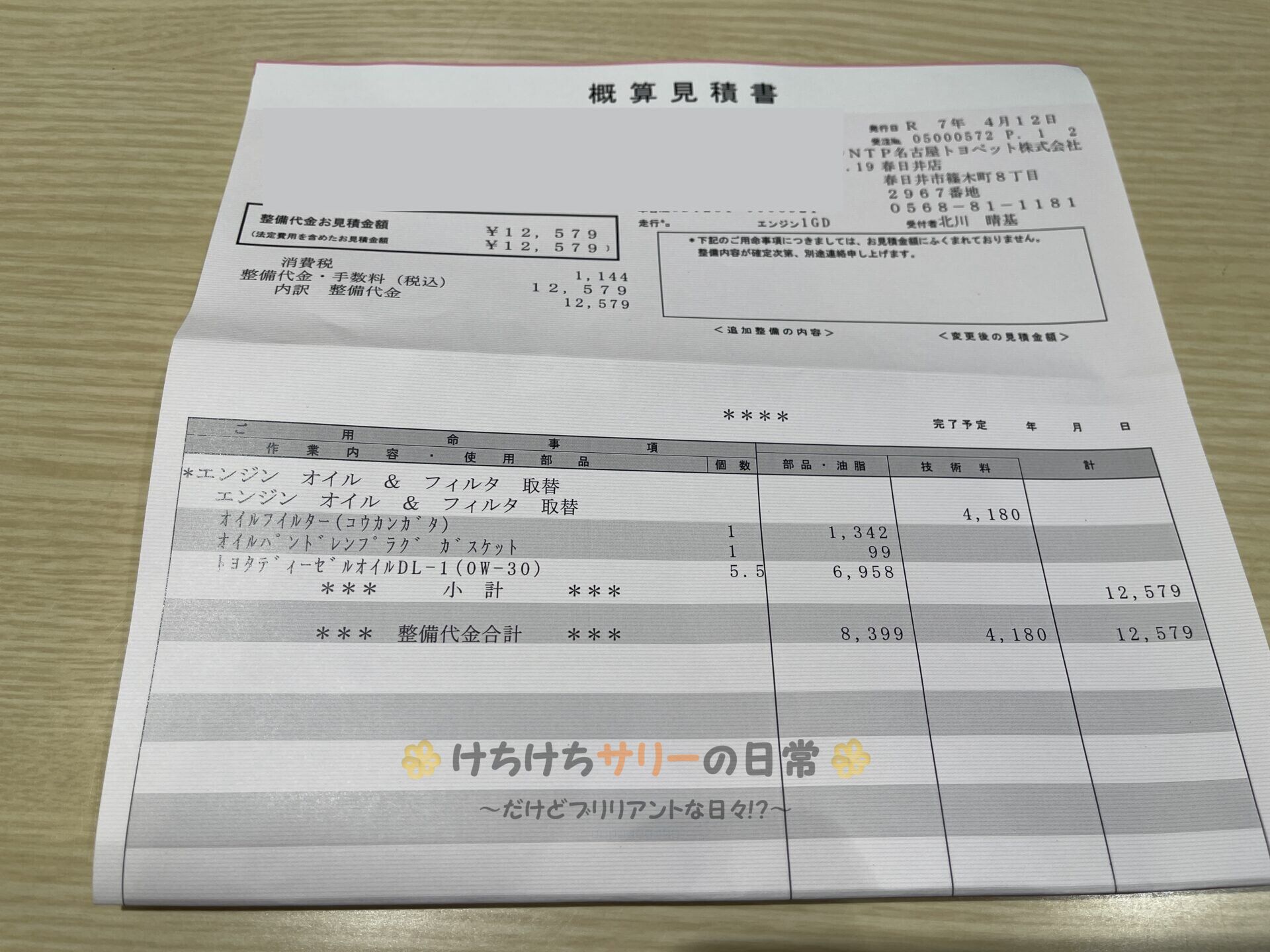 最終支払い金額はエンジンオイル&フィルタ交換で12,579円だったよ👍 なんかちょっと得した気分🎵