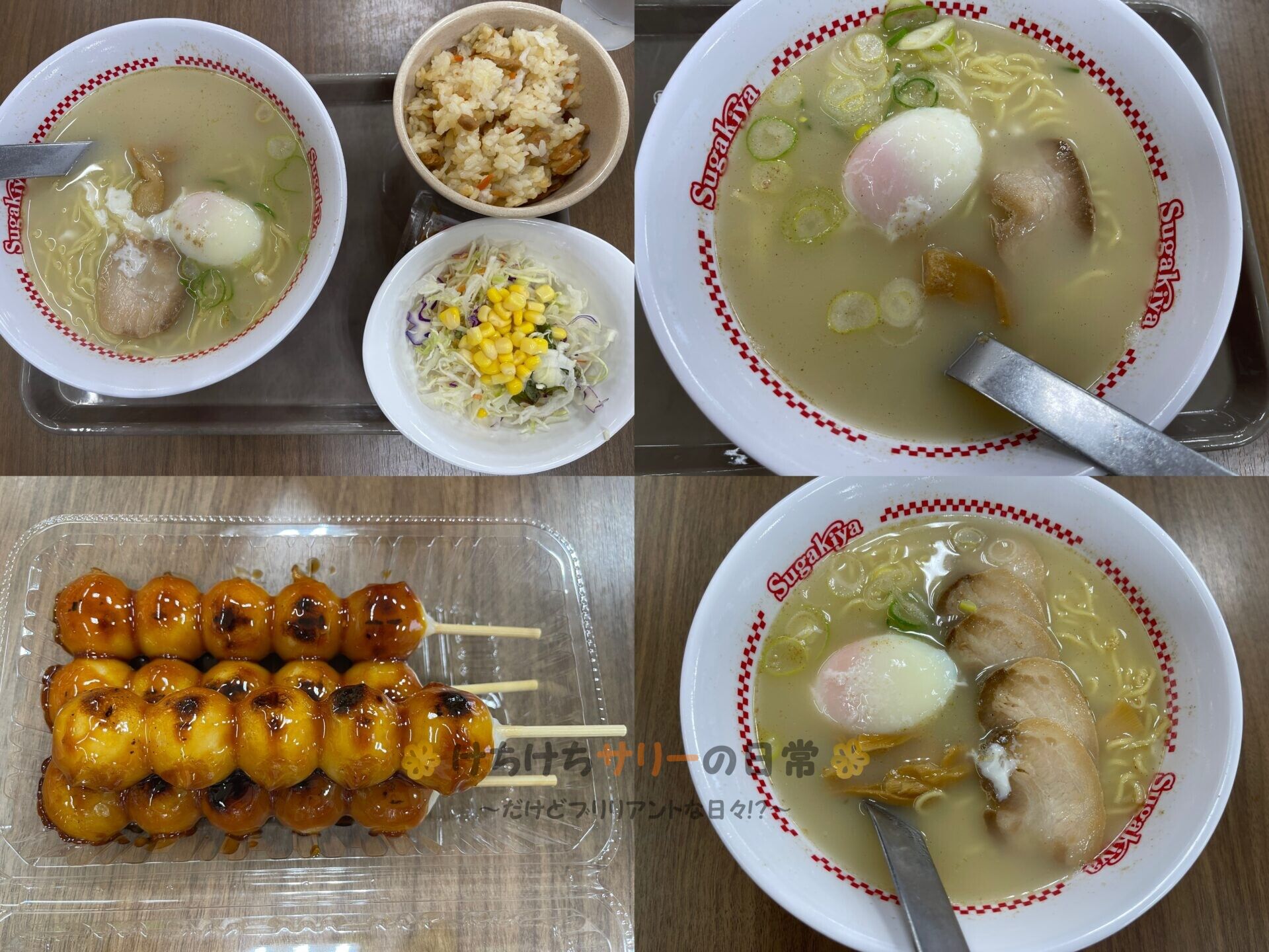 この日はサリーと相方は写真右上の「玉子入ラーメン:530円」を食べつつ、1個は「五目・サラダセット:330円」にして五目ご飯とサラダは2人で半分こしたよ。サリーパパは写真右下の「特製ラーメン:630円」。食後は「みたらし:120円」をサリーと相方は1本ずつ、サリーパパは2本食べたよ😋