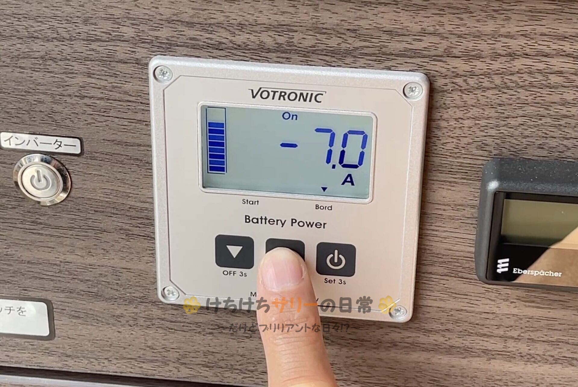 この日は天気が良かったから停車中でも電気はほとんど減らないはず。 充電状態をチェックしてみると、まだ日が差しているのに7Aの消費…🥺 太陽光充電ができていなさそう…。