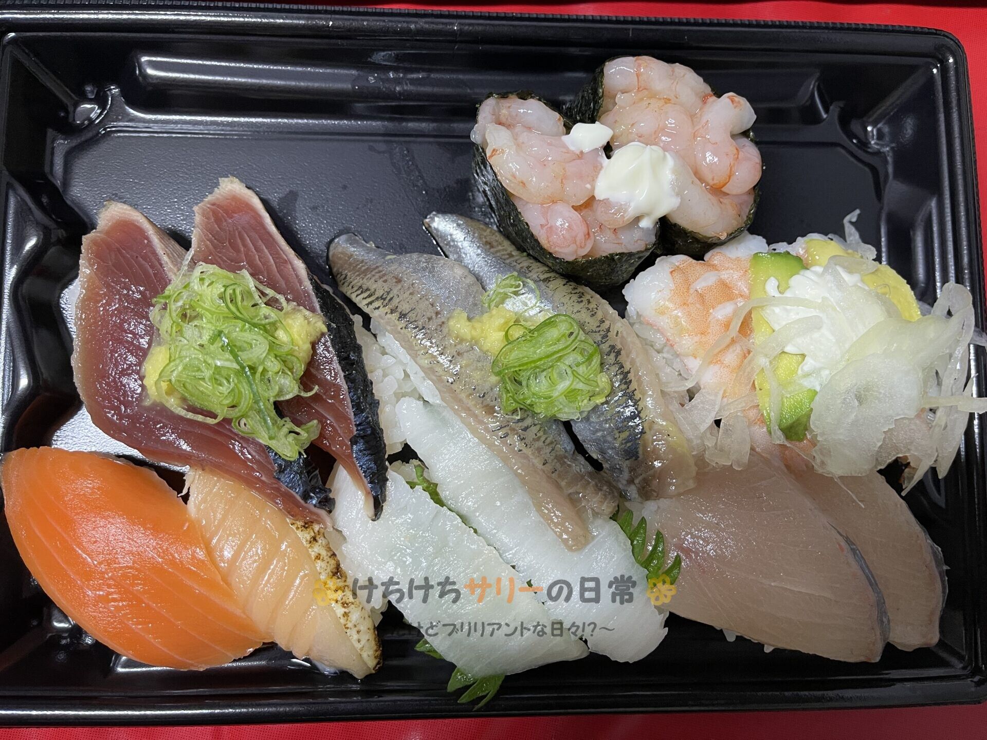 ⚫︎一本釣りカツオのたたき、●北海道いわし(ネギ・生姜)、⚫︎えびアボカド