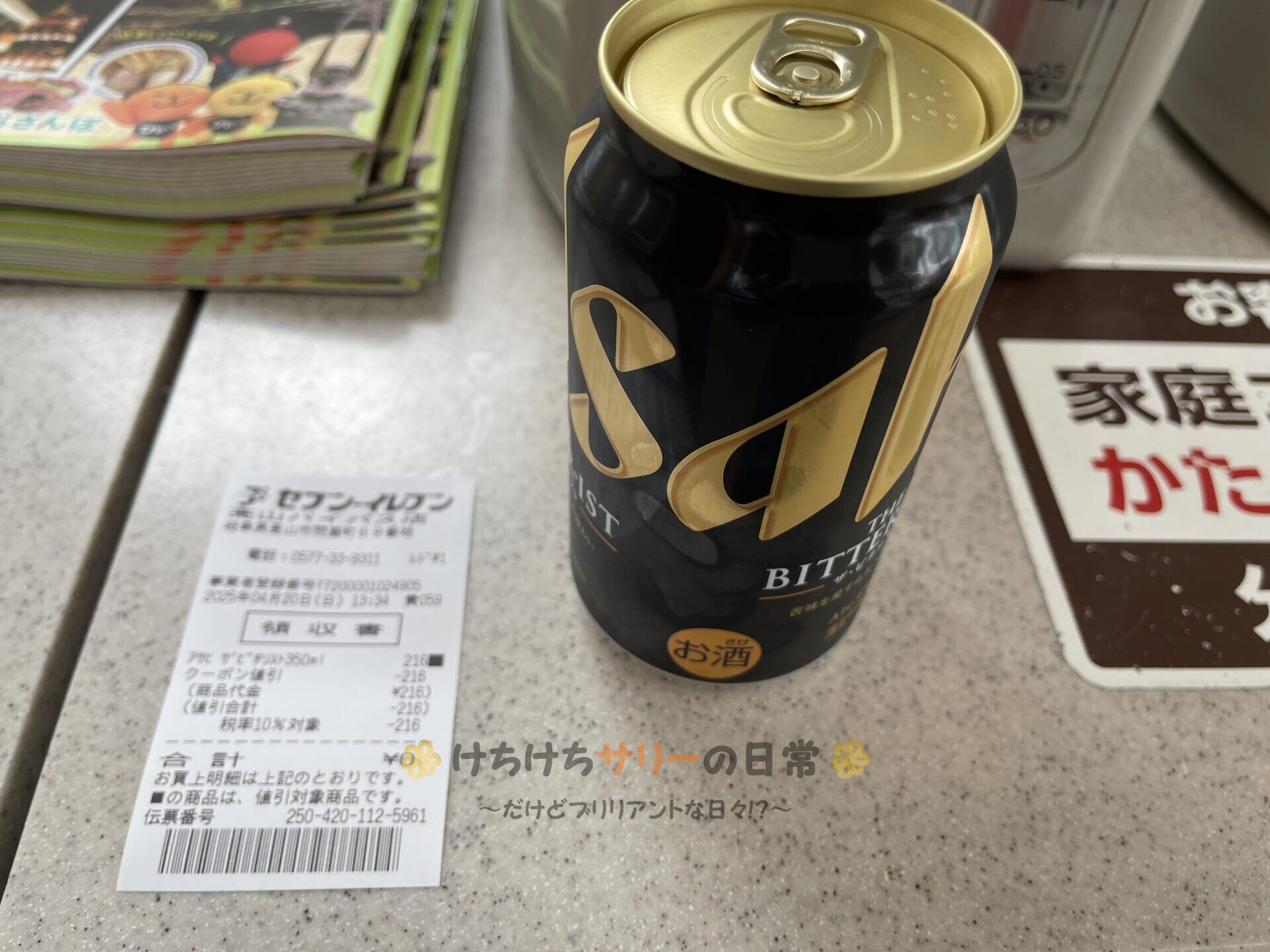 少し前にローソンで1本交換した「THE BITTER-IST:216円」を無料クーポンでゲット!! 抽選する時にコンビニを選べるんだけど、サリーと相方で選ぶコンビニが違うからこの日はセブンイレブンでの交換となったの。