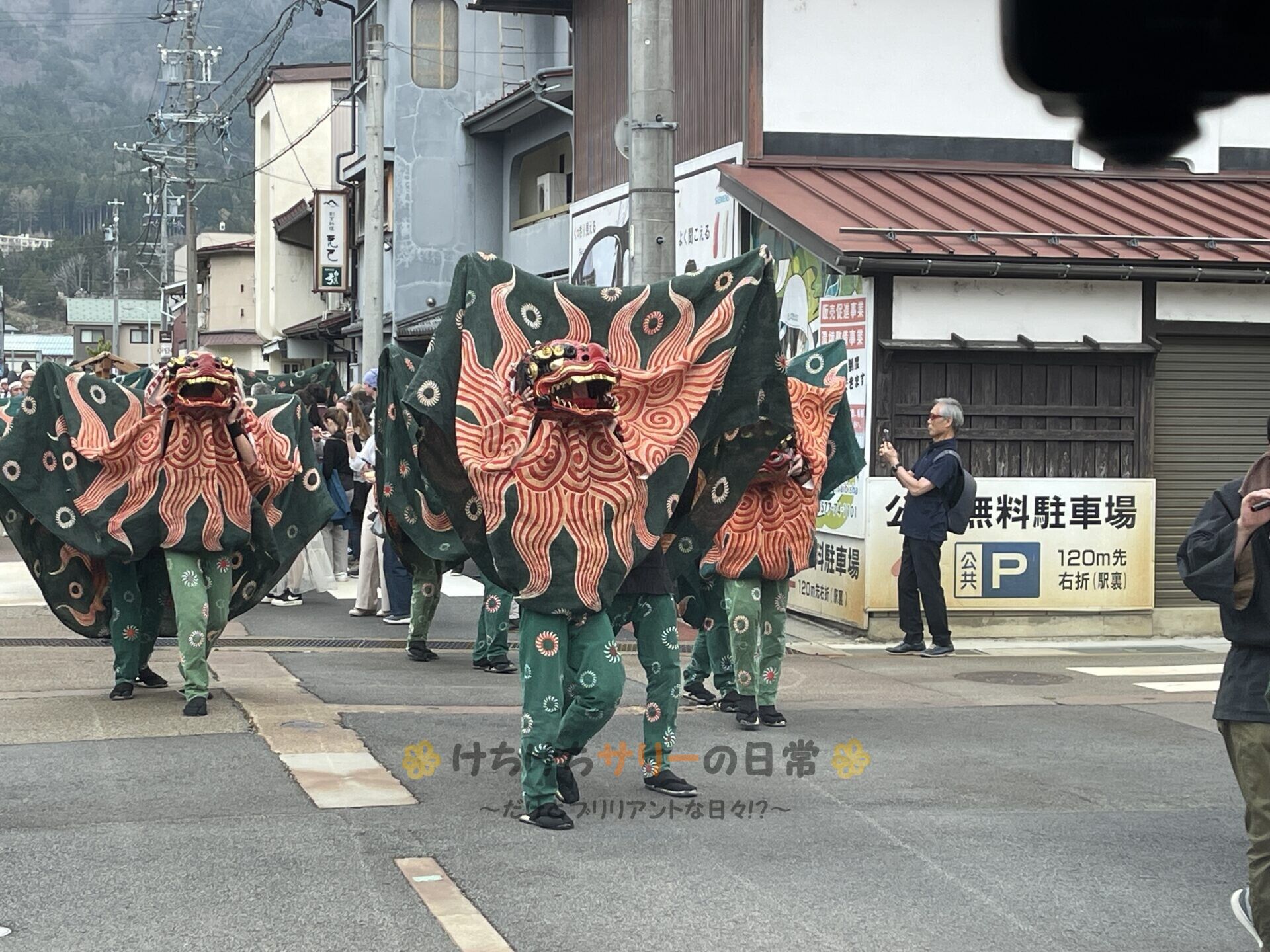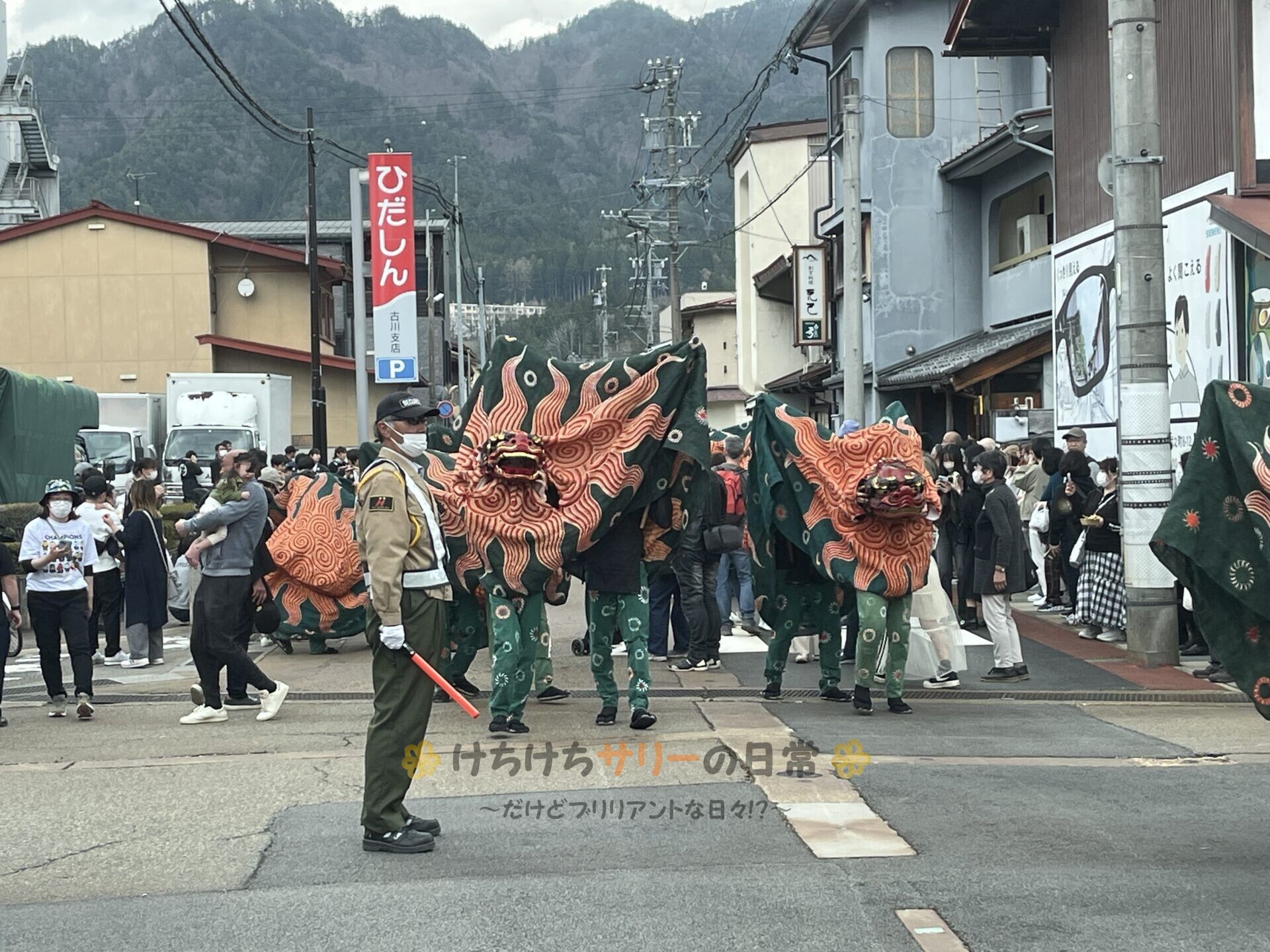 多分、毎年4月19~20日に開催されている古川祭の獅子舞だと思う。 大きな山車とかは見なかったけど、道を封鎖して大規模なお祭りの雰囲気があったよ‼