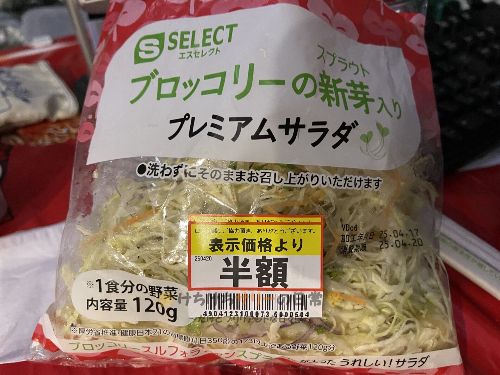こちらは、買いたてほやほやの半額でゲットしたブロッコリーのスプラウト入りプレミアムサラダ。