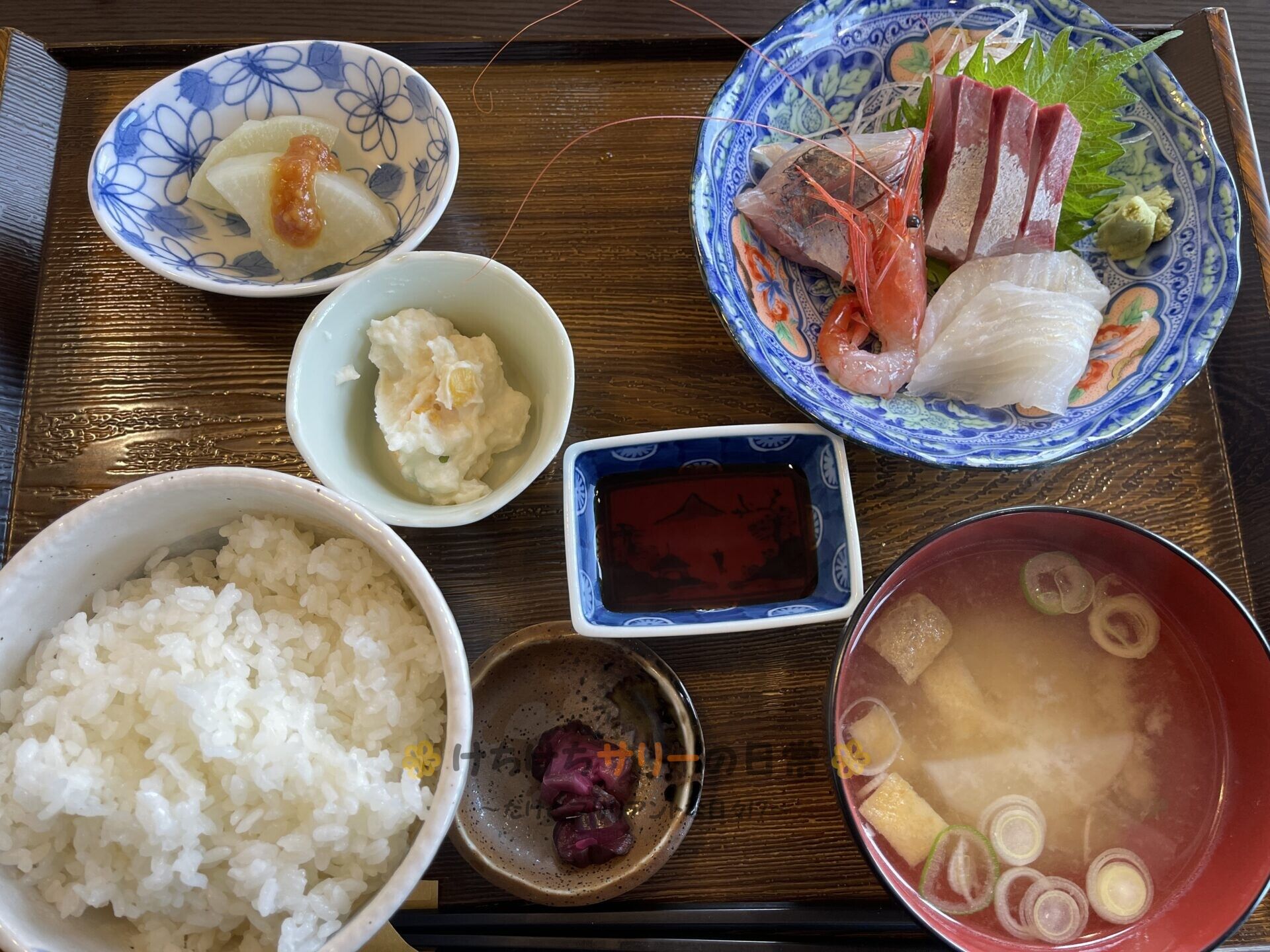 相方は「お刺身定食:1,400円」を注文。 この日のお刺し身は真アジ、ハマチ、塩カレイ、甘エビ。4種類も付くなんて豪華で良いね~👍