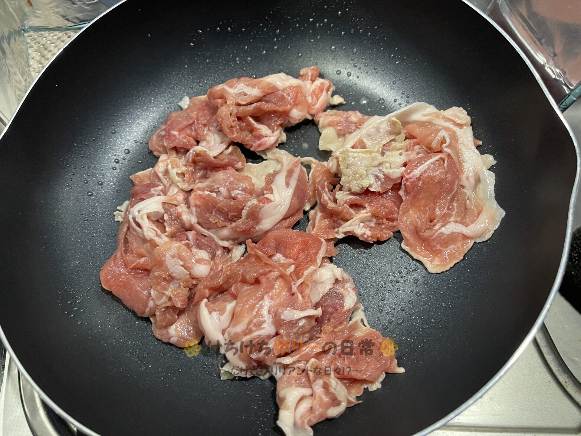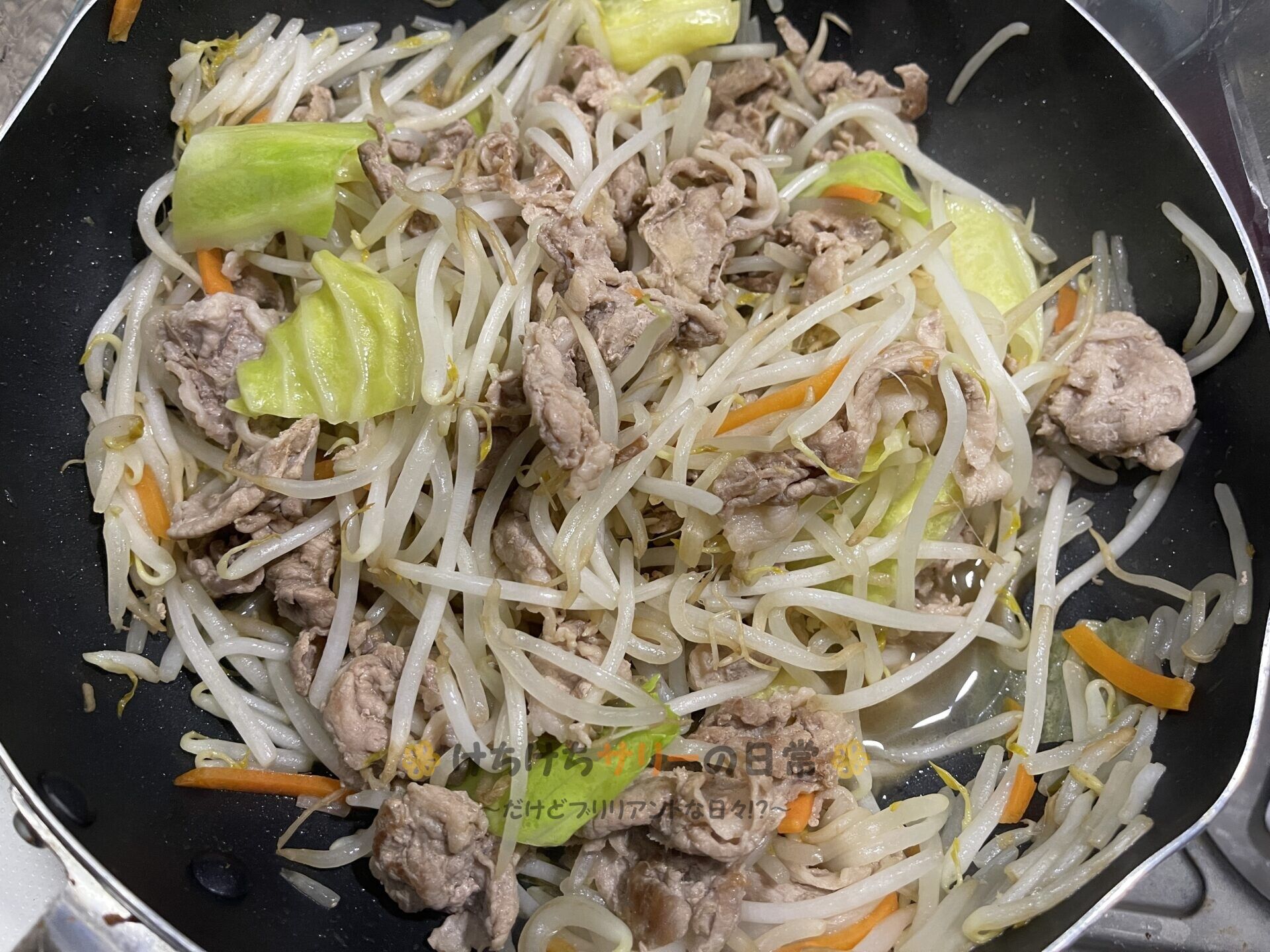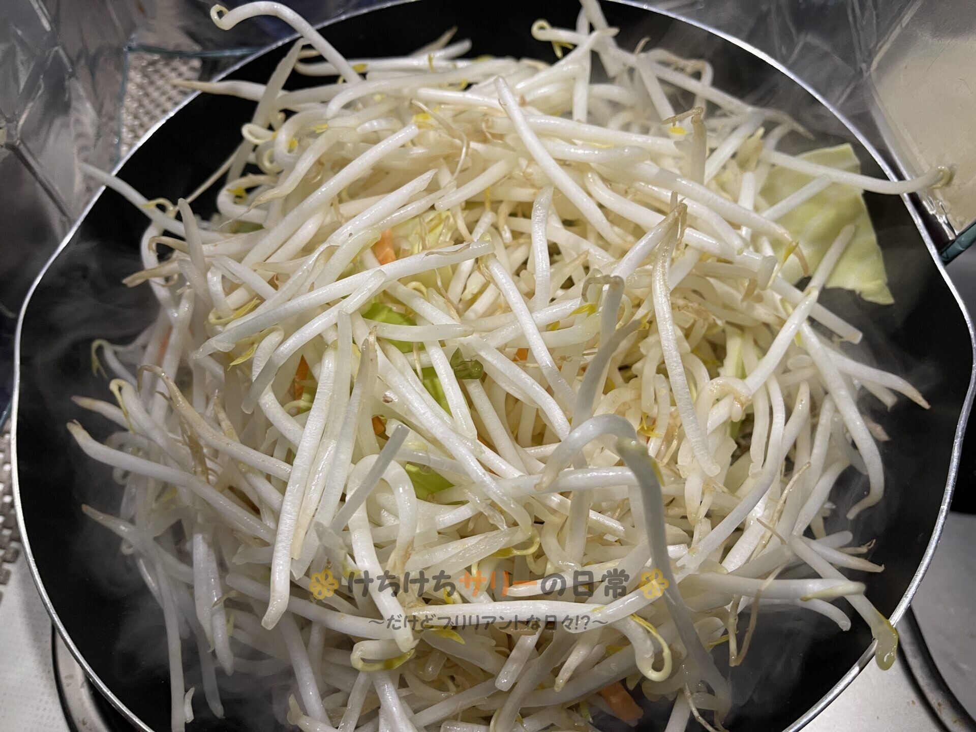 前の日に半額でゲットしたもやし炒めの材料も投入。