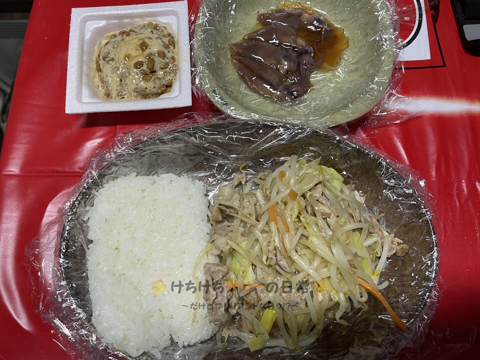 この日の夕ご飯は「ご飯」、「納豆」、「豚肉入り野菜炒め」、「ホタルイカの沖漬け」だよ。