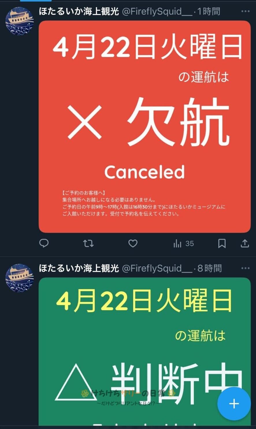 8時間前は"判断中"だったのに"運航は欠航"に変わってた😭 …という事は波が高くてほたるいかは期待できないという事。
