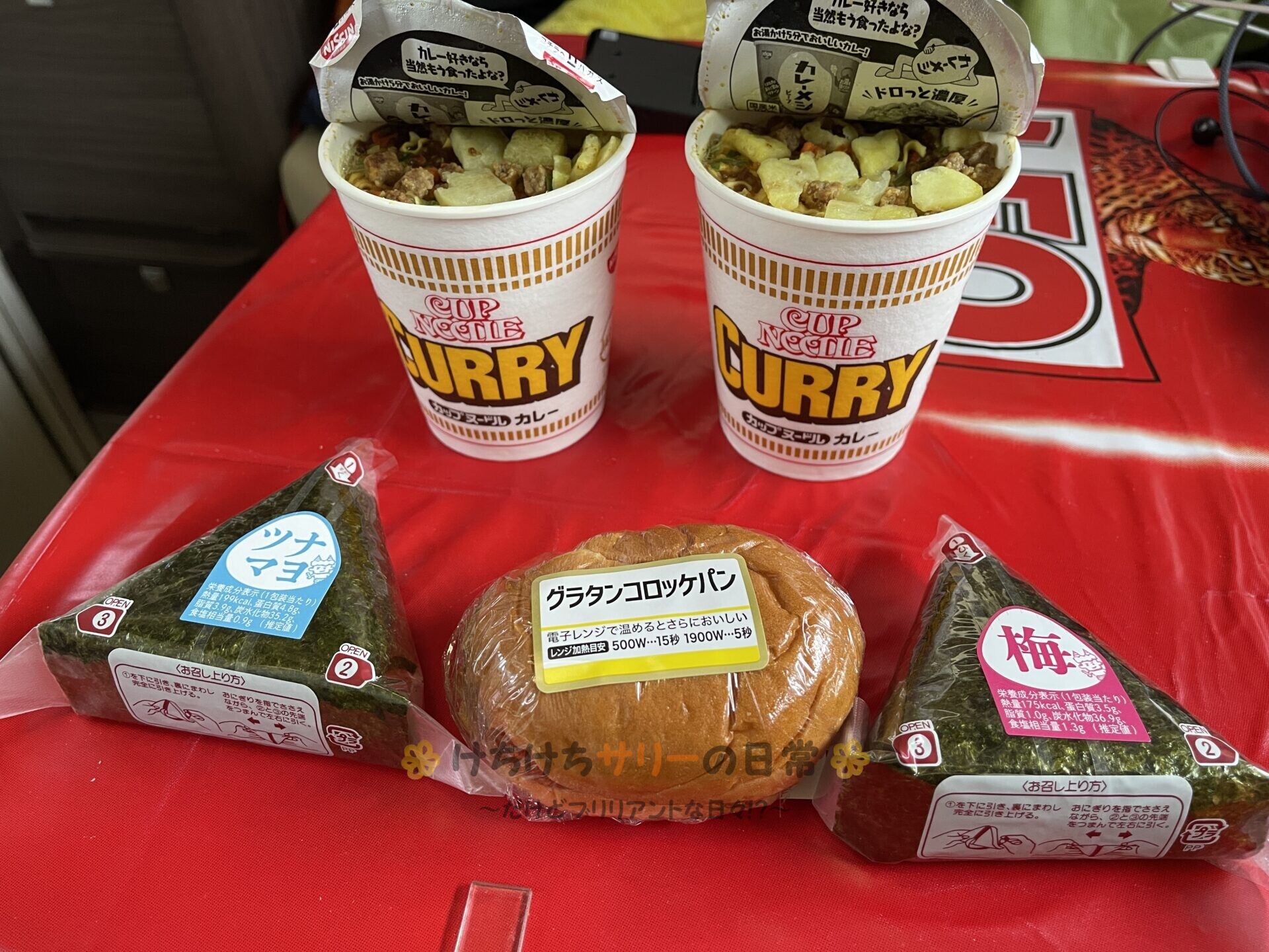 この日のお昼ご飯は「カップヌードルカレー味」。それに加えてサリーは「おにぎり梅」、相方は「おにぎりツナ」と「グラタンコロッケパン」だよ。