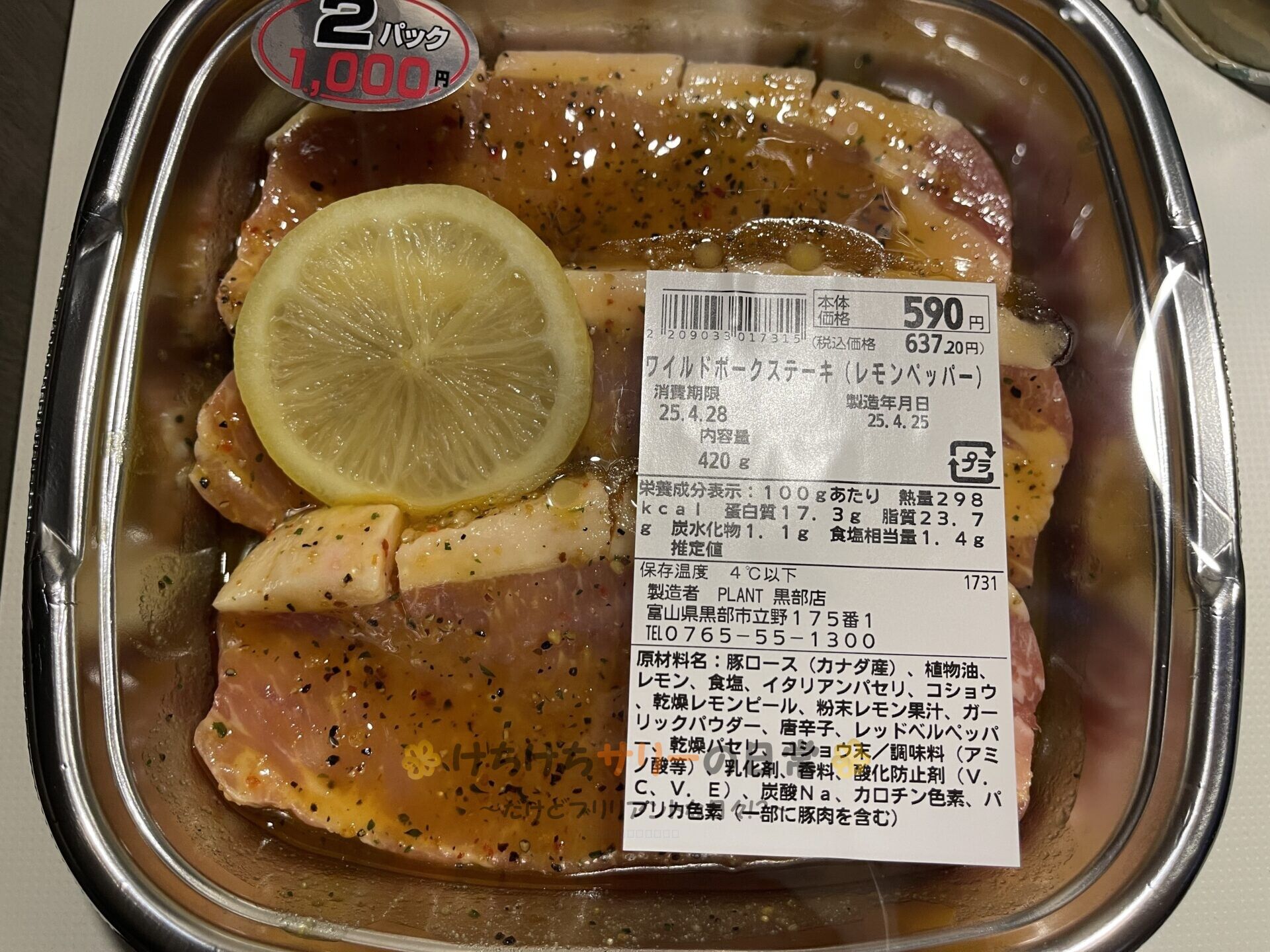 この日の夕ご飯は「ご飯」、「ワイルドポークステーキ レモンペッパー味」、「キャベツサラダ」、「納豆」だよ。
