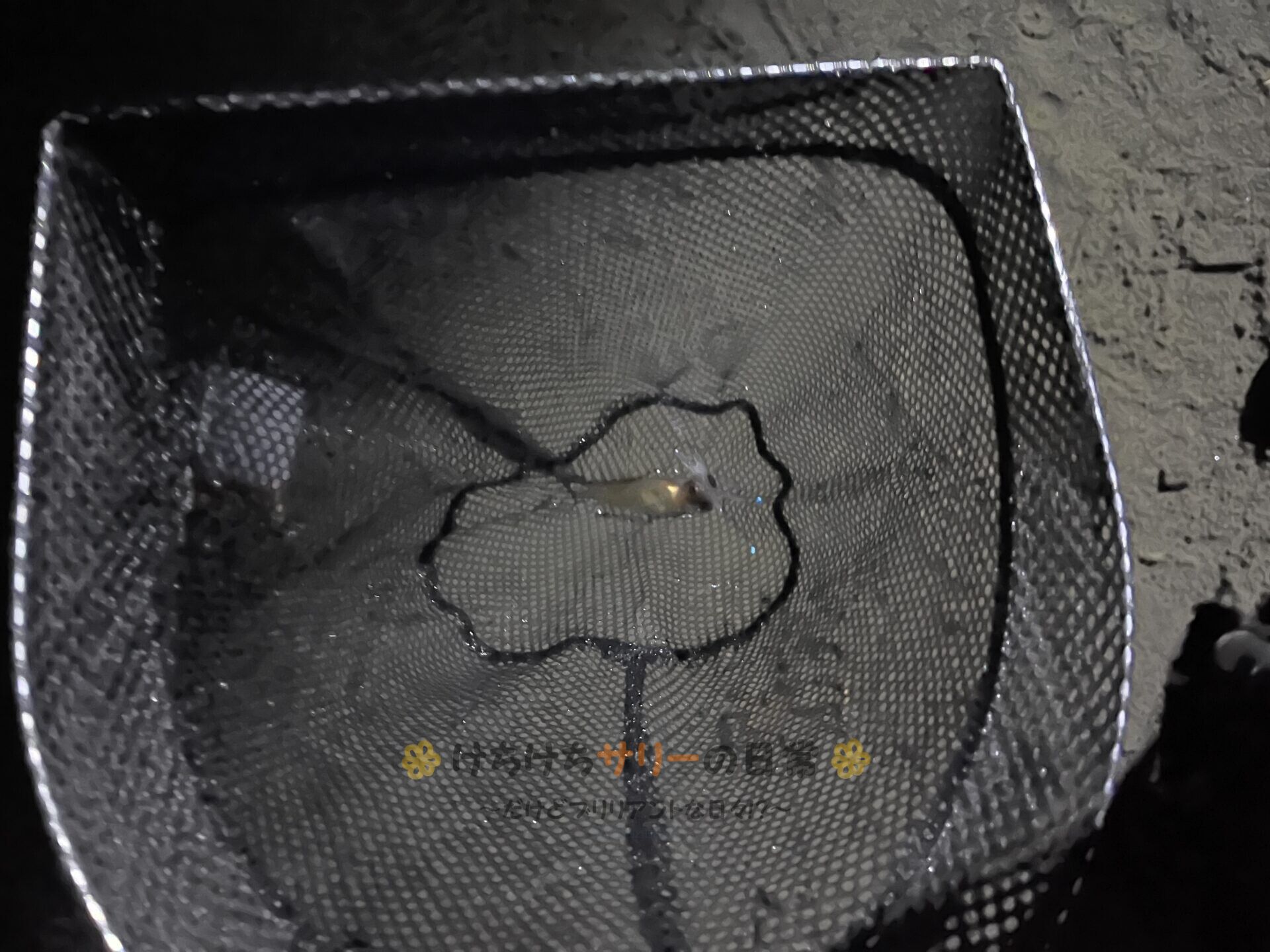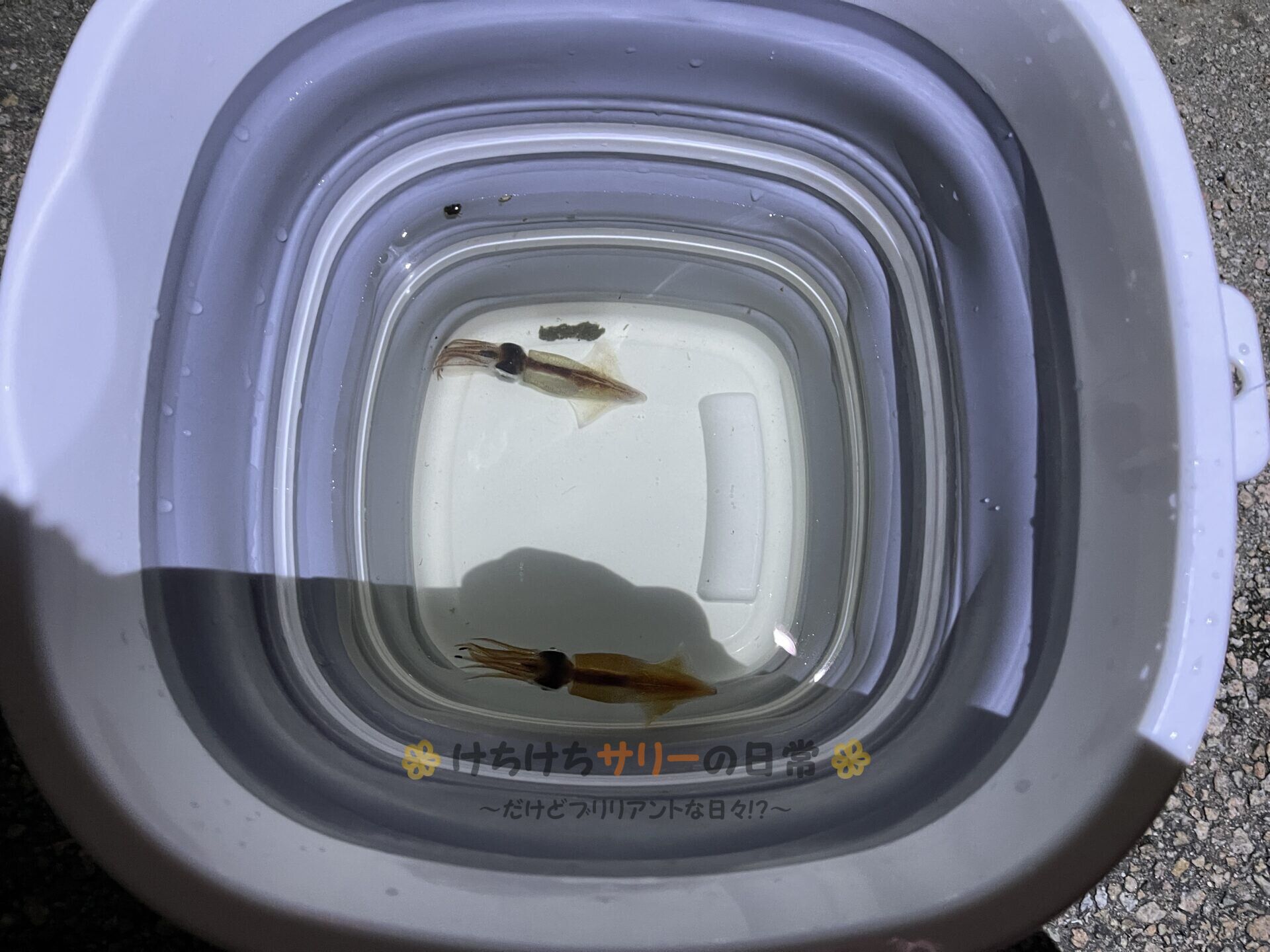 皆からしたら『なんだ、たった2匹か』という感じだと思うけど、ここまで1匹も見ていない日が続いたサリーと相方にとっては2匹でも釣果があるだけ、めちゃくちゃ嬉しいよ。 すくった2匹は先に獲れた4匹で作った沖漬けの袋に生きたまま入れた👍