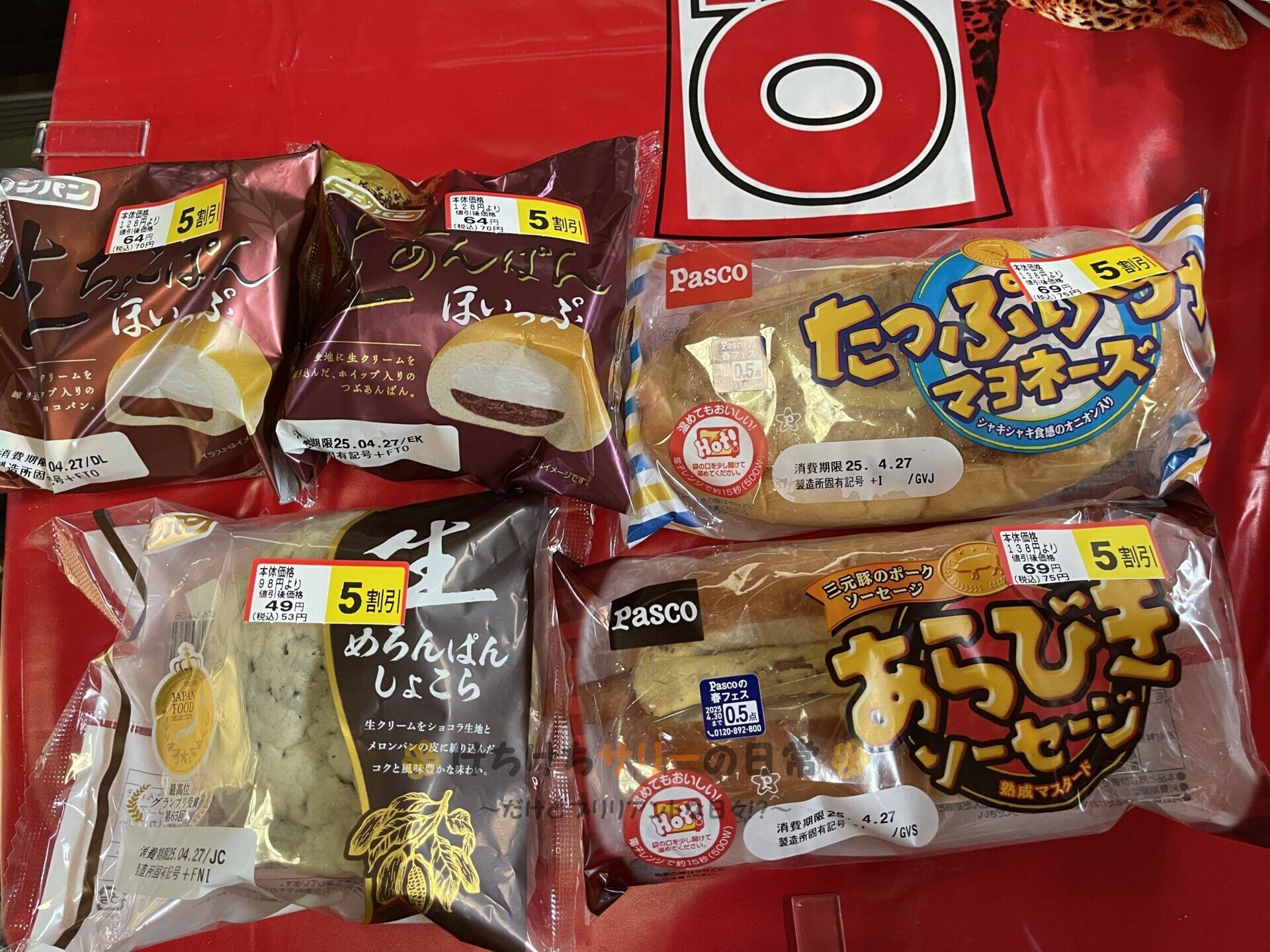 この日のお昼ご飯はさっき半額で買ったパン🍞 「あらびきソーセージ:半額で75円」と「たっぷりツナマヨネーズ:半額で75円」は相方と半分こ!「あんぱんほいっぷ:半額で70円」はサリーと相方で1個ずつ食べて「生めろんぱんしょこら:半額で53円」は相方が食べたよ。