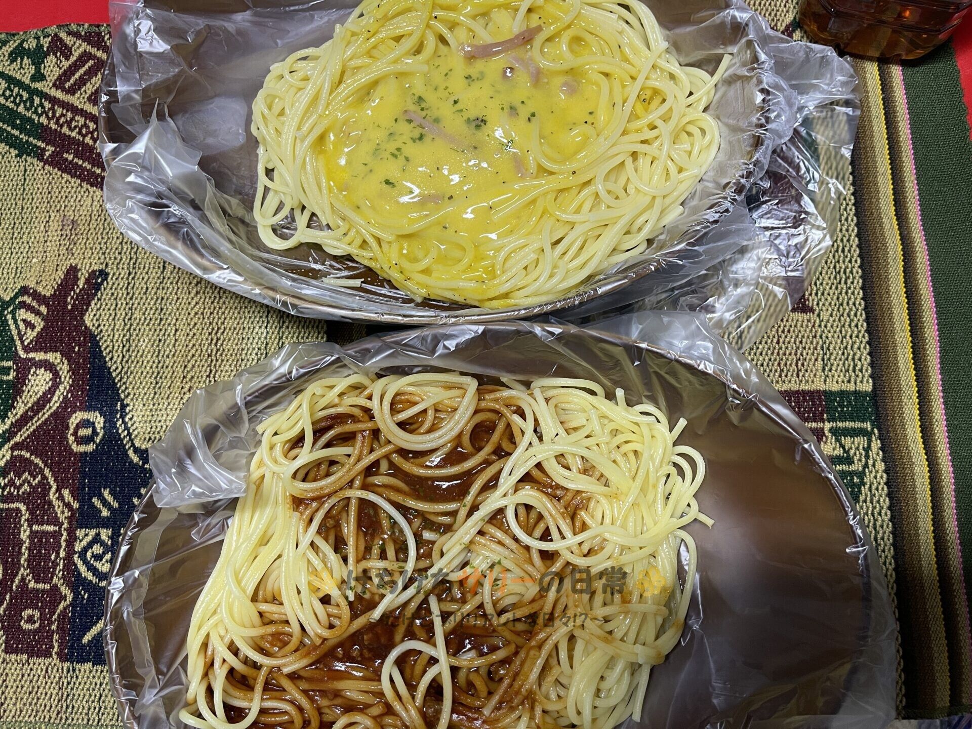 この日の夕ご飯はサリーは冷凍の「ボロネーゼスパゲッティ:214円」、相方は冷凍の「カルボナーラスパゲッティ:214円」。