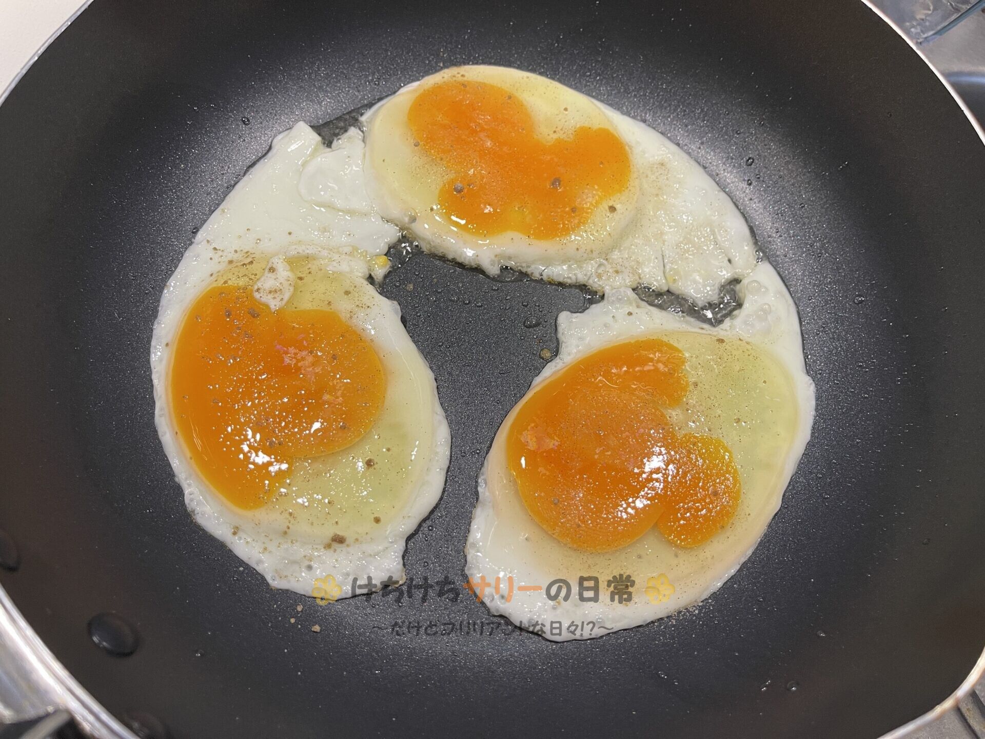 生玉子のままで焼いてももちろん良いんだけど、それだと切った時に黄身がトローッと落ちてくるから焼いた方が手を汚さずに食べられから先に焼く方式にしてみたよ😊