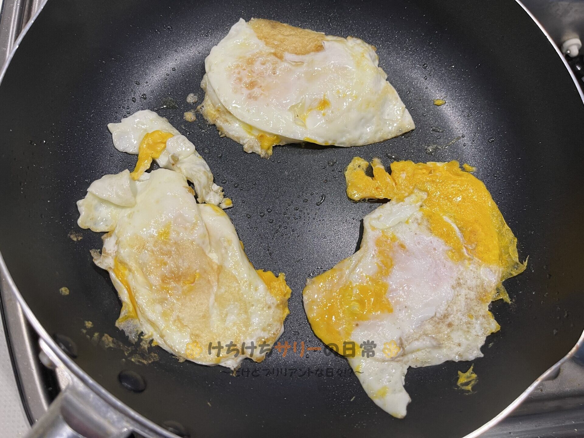 裏側も軽く焼いておこう。 自由に洗い物ができないからフライ返しを使わなかったら見た目がアレになっちゃったけど、味は変わらないのでマイペンライ👍